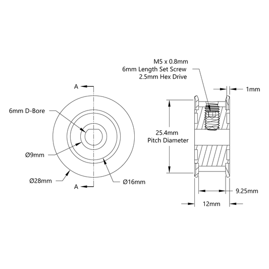 3417 Series 5mm HTD Pitch Set-Screw Pinion Timing Belt Pulley (6mm D-Bore, 16 Tooth)