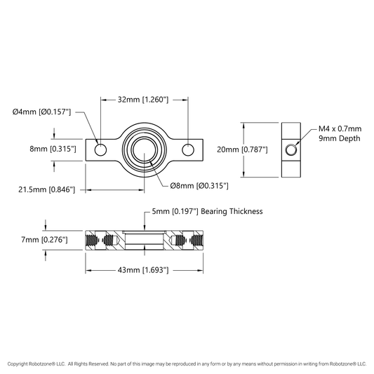 8mm Bore 2-Side, 1-Post Pillow Block (43mm Width)