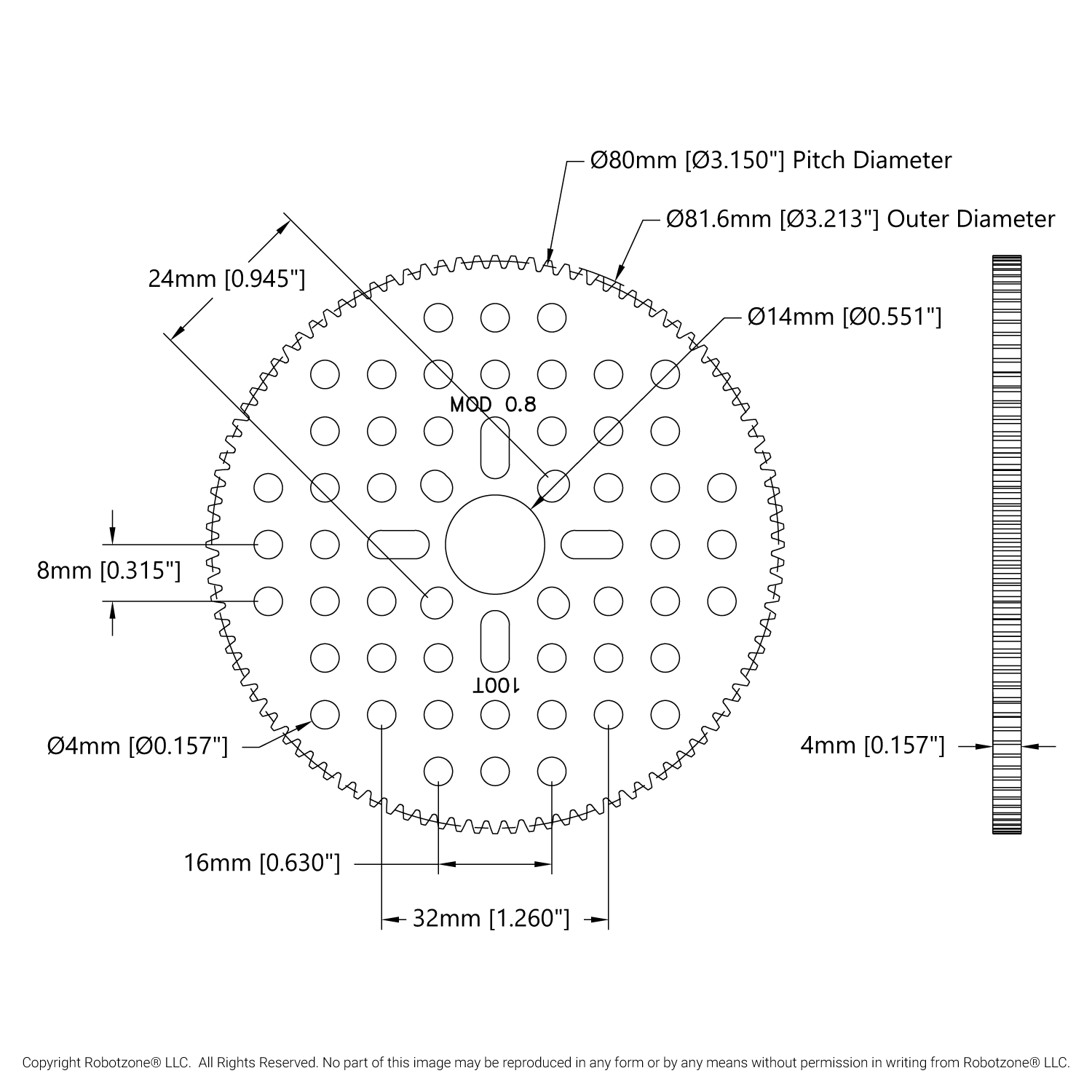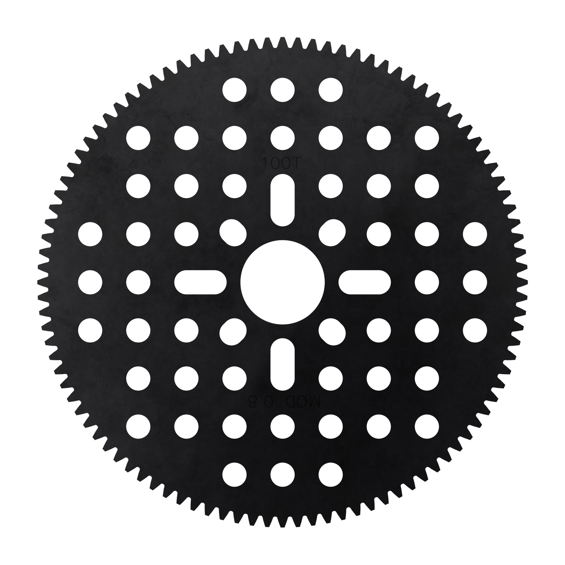 The 100 tooth, MOD 0.8 gear will mate with any MOD 0.8 gear, but when building on pattern, the most common partner for this gear is a 20 tooth pinion gear or servo gear. Using the pinion gear, you can create a 5:1 underdrive or overdrive setup (depending on your application). When used with the 20 tooth servo gear, this combo creates a 5:1 underdrive that facilitates slower speed and five times the torque.