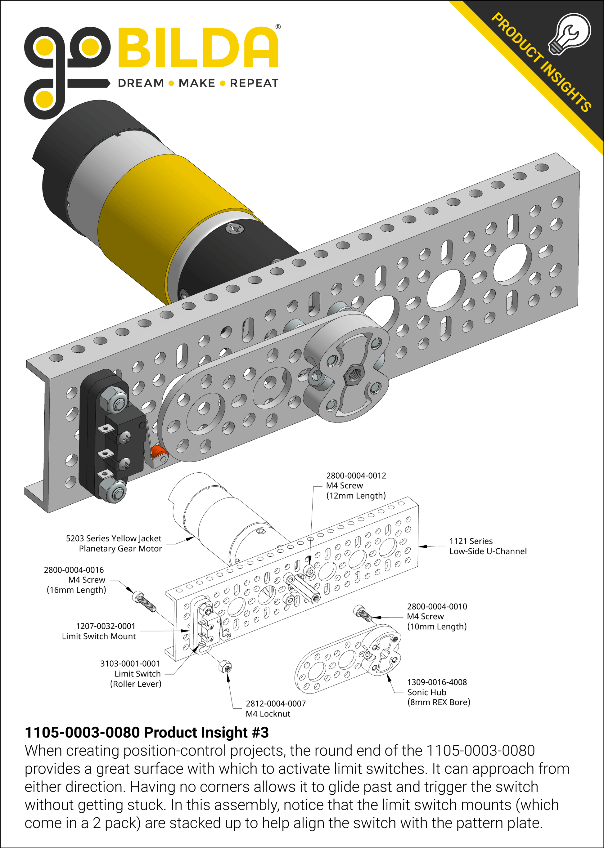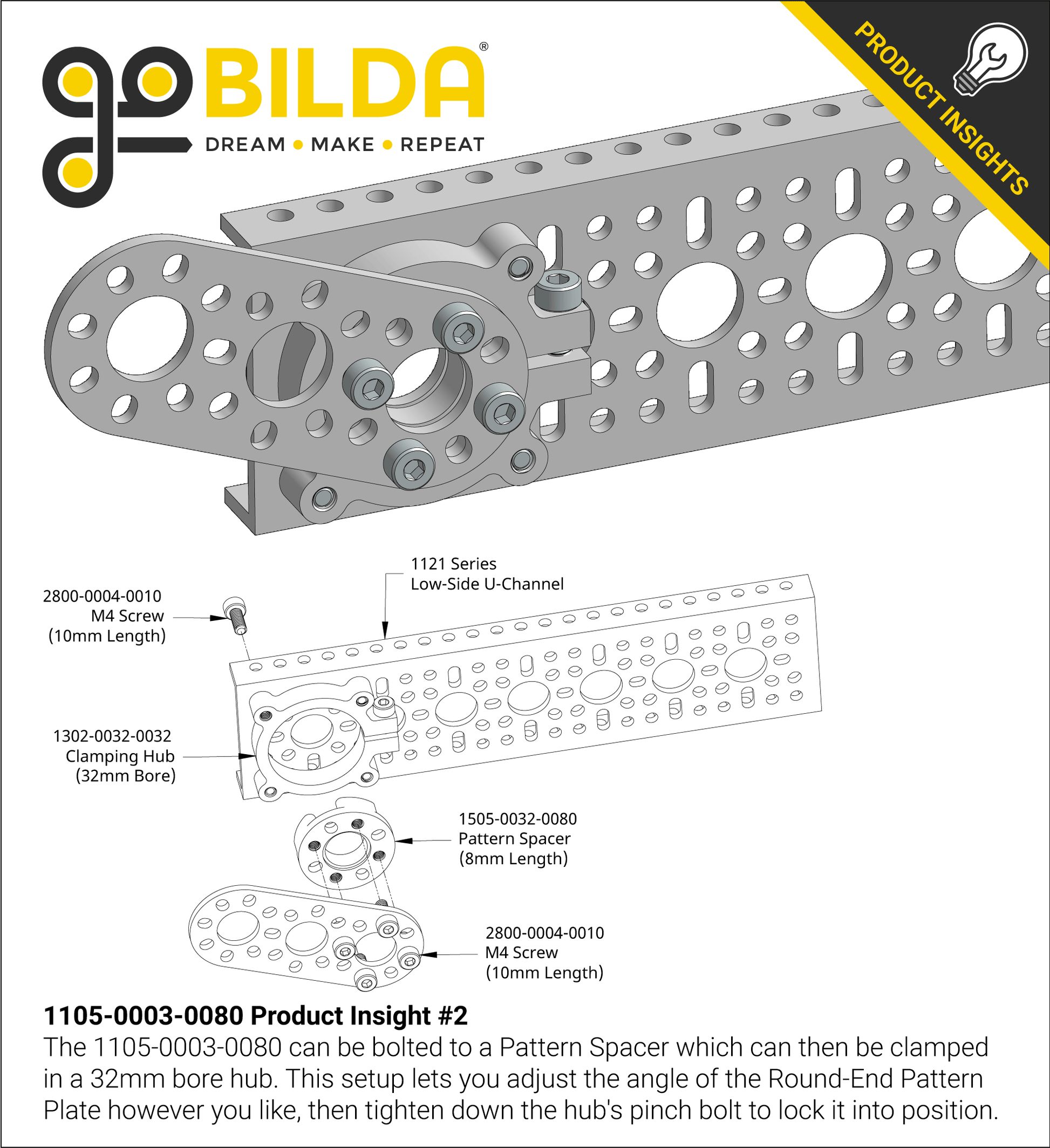 This 3-hole Round-End Pattern Plate is made of 2.5mm thick aluminum - striking a great balance between weight and strength. The 16mm goBILDA pattern, which has been slotted to 24mm across center, repeats down the length of the plate providing many mounting options. The 14mm holes can be used for 14mm OD bearings as well as parts which contain a 14mm protrusion (like hubs) to ensure concentricity. The 32mm width makes for a more compact option when compared to 1123 Series Pattern Plates. The rounded shape provides added clearance for nearby rotating components.