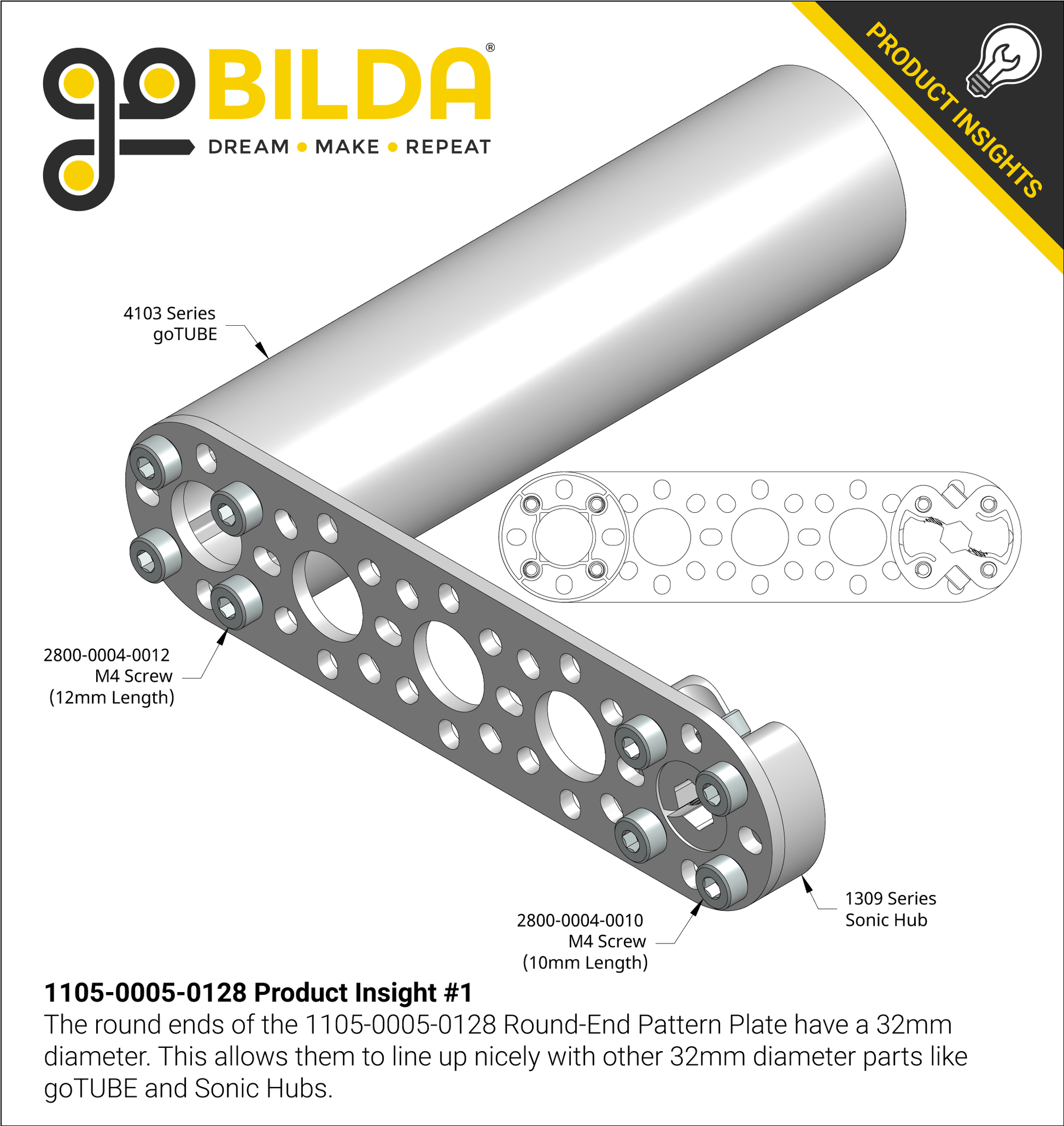 This 5-hole Round-End Pattern Plate is made of 2.5mm thick aluminum - striking a great balance between weight and strength. The 16mm goBILDA pattern, which has been slotted to 24mm across center, repeats down the length of the plate providing many mounting options. The 14mm holes can be used for 14mm OD bearings as well as parts which contain a 14mm protrusion (like hubs) to ensure concentricity. The 32mm width makes for a more compact option when compared to 1123 Series Pattern Plates. The rounded shape provides added clearance for nearby rotating components.