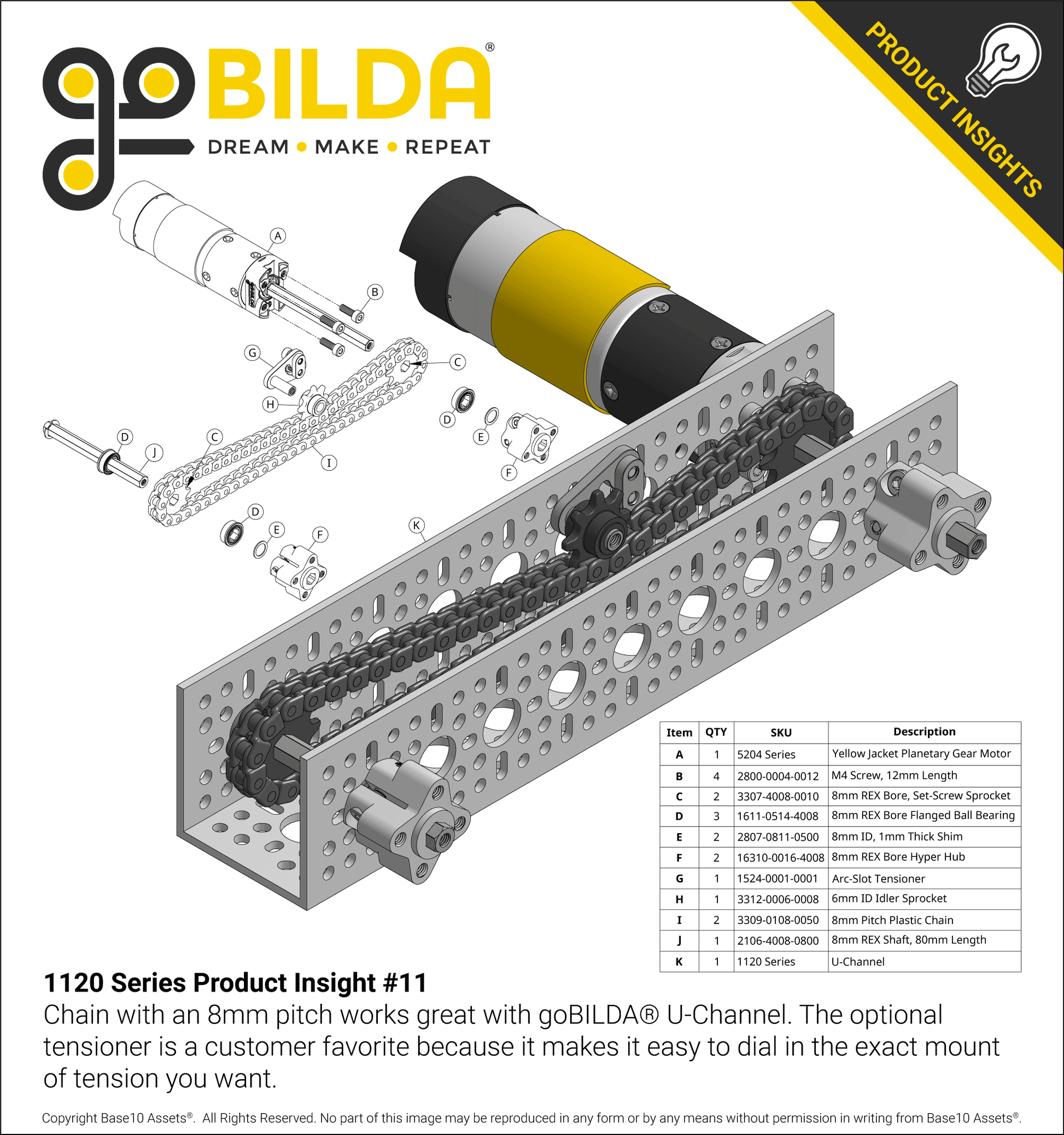 U-Channel is a foundational component in the goBILDA® system. Its perpendicular, on-pattern structure provides for the mounting of other structural components, as well as the seating of bearings to create robust motion assemblies.