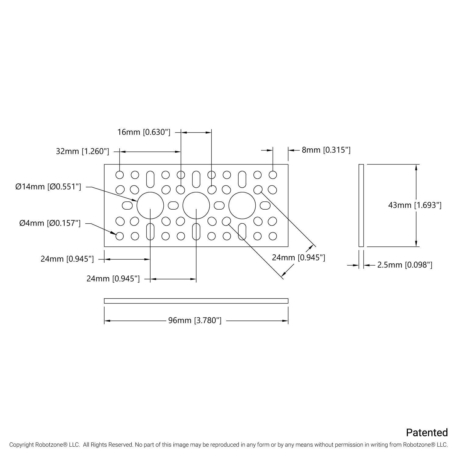 Pattern plates provide multi-purpose build surfaces to projects both big and small! Plates featuring a 43mm width are particularly versatile for their flush fit inside goBILDA® U-Channel. This allows for unique installations, such as fourth channel walls, that equip your build with new mounting options and strengthen its structure!