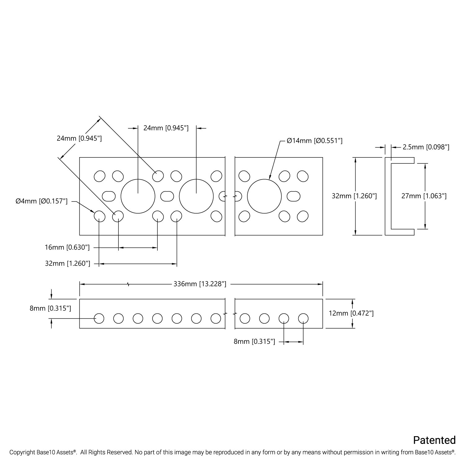 This 13 Hole, 336mm Length Mini Low-Side U-Channel brings a compact core structure to your build. Its minimized footprint allows for strong small-scale construction utilizing its goBILDA® 16mm pattern holes. You can attach standoffs, spacers, block mounts, beams, and more—including motors!