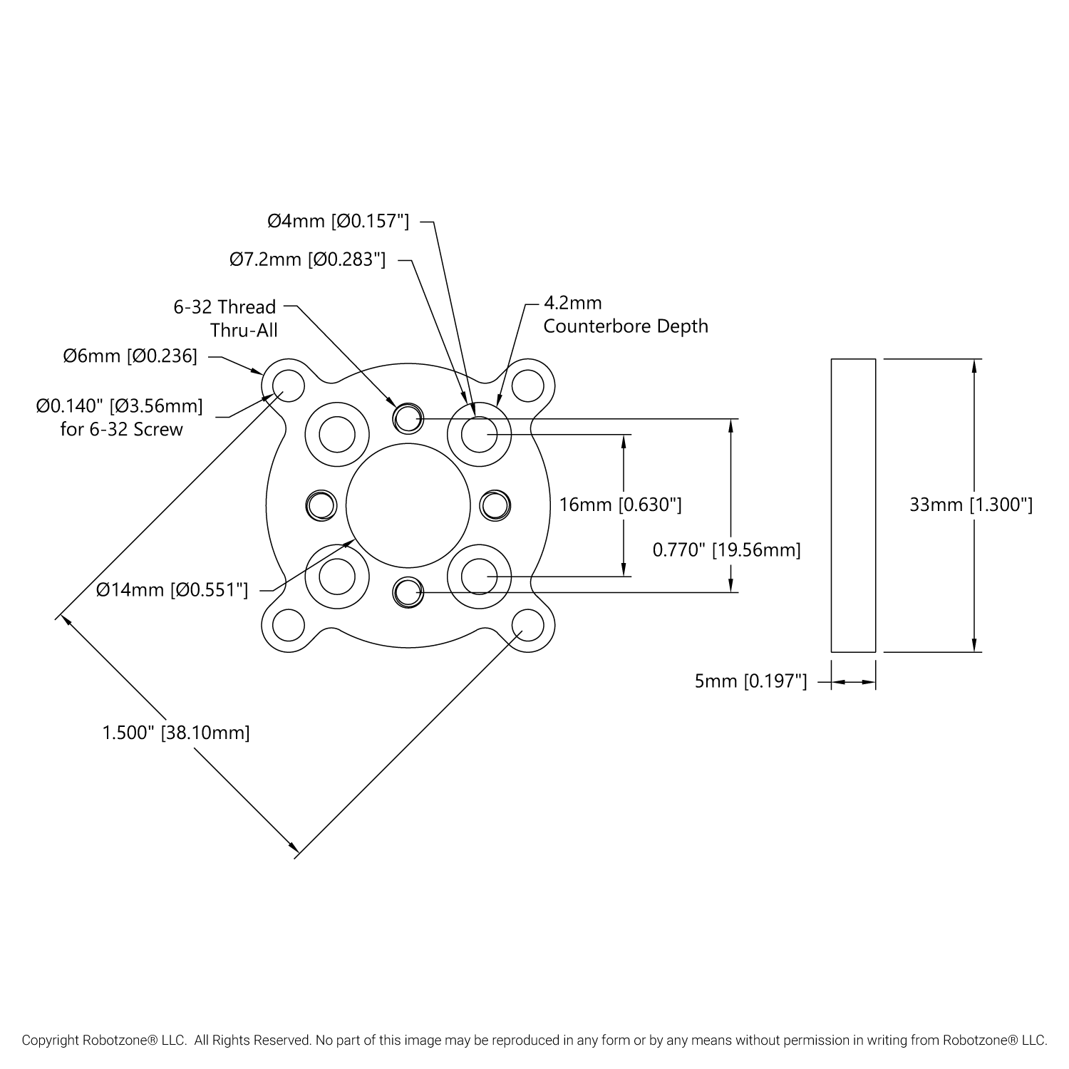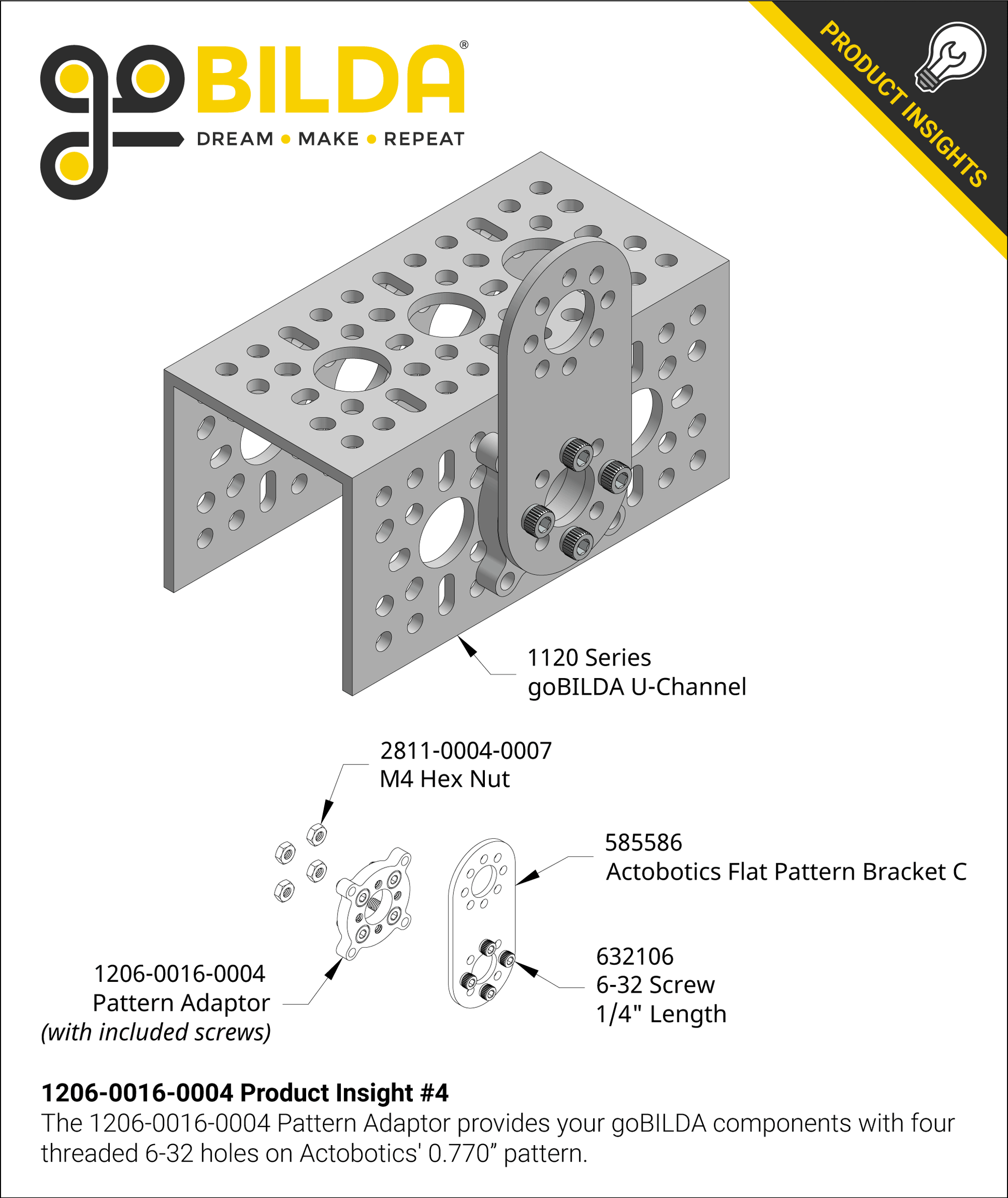 This pattern adaptor contains thru-holes for M4 screws on the goBILDA 16mm pattern, 6-32 UNC threaded holes on the Actobotics 0.77" hub pattern and thru-holes for 6-32 screws on the Actobotics 1.5” hub pattern. Use it to adapt a 5202 Series Yellow Jacket Gear Motor to your Actobotics assembly or fasten structural components together with ease when mixing the two systems. When using with a 5202 Series Yellow Jacket Gear Motor, the included M4 screws will nest down into the counterbores of the part to allow the motor/adaptor assembly to rest flush against the Actobotics part you wish to fasten to.