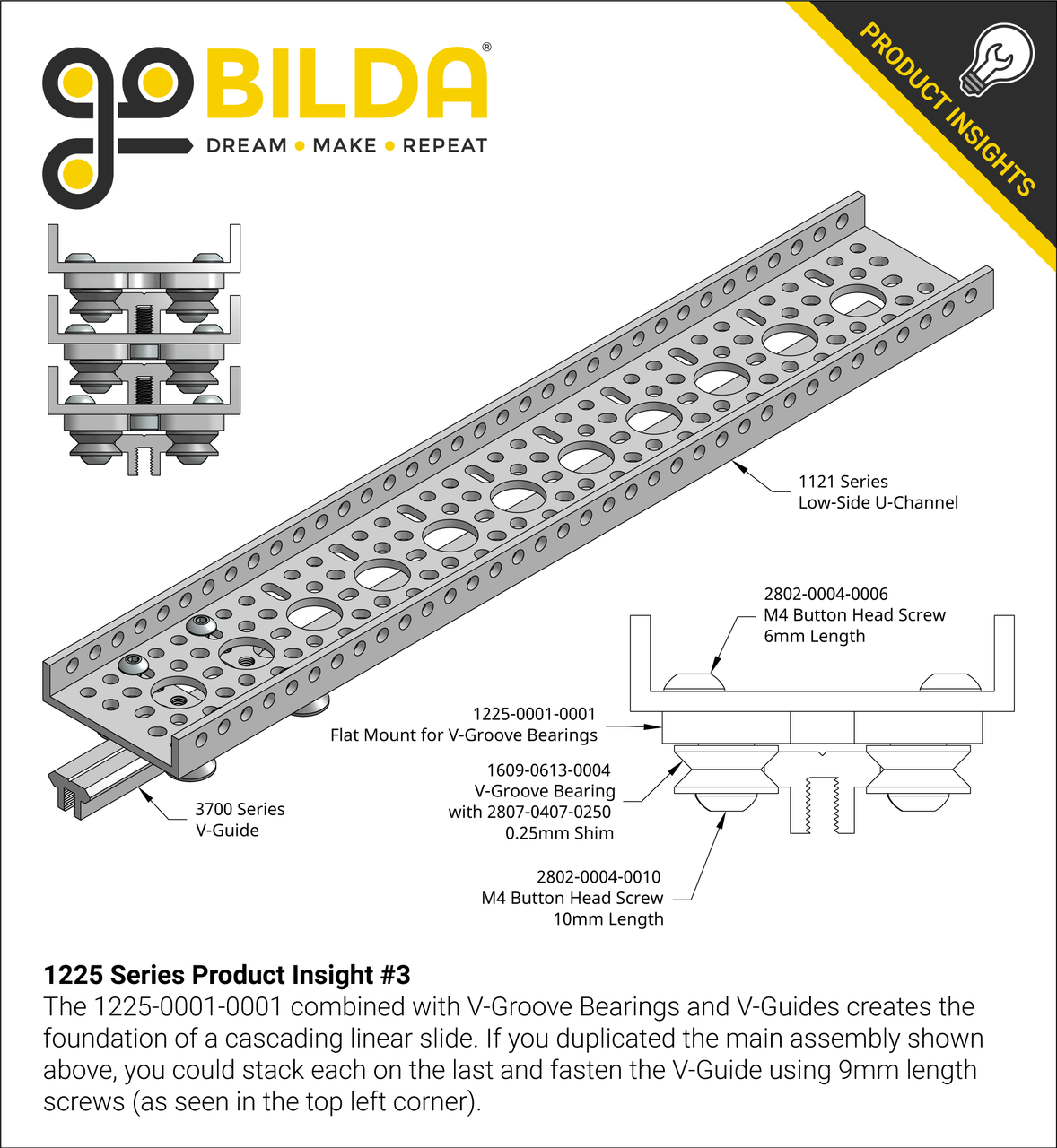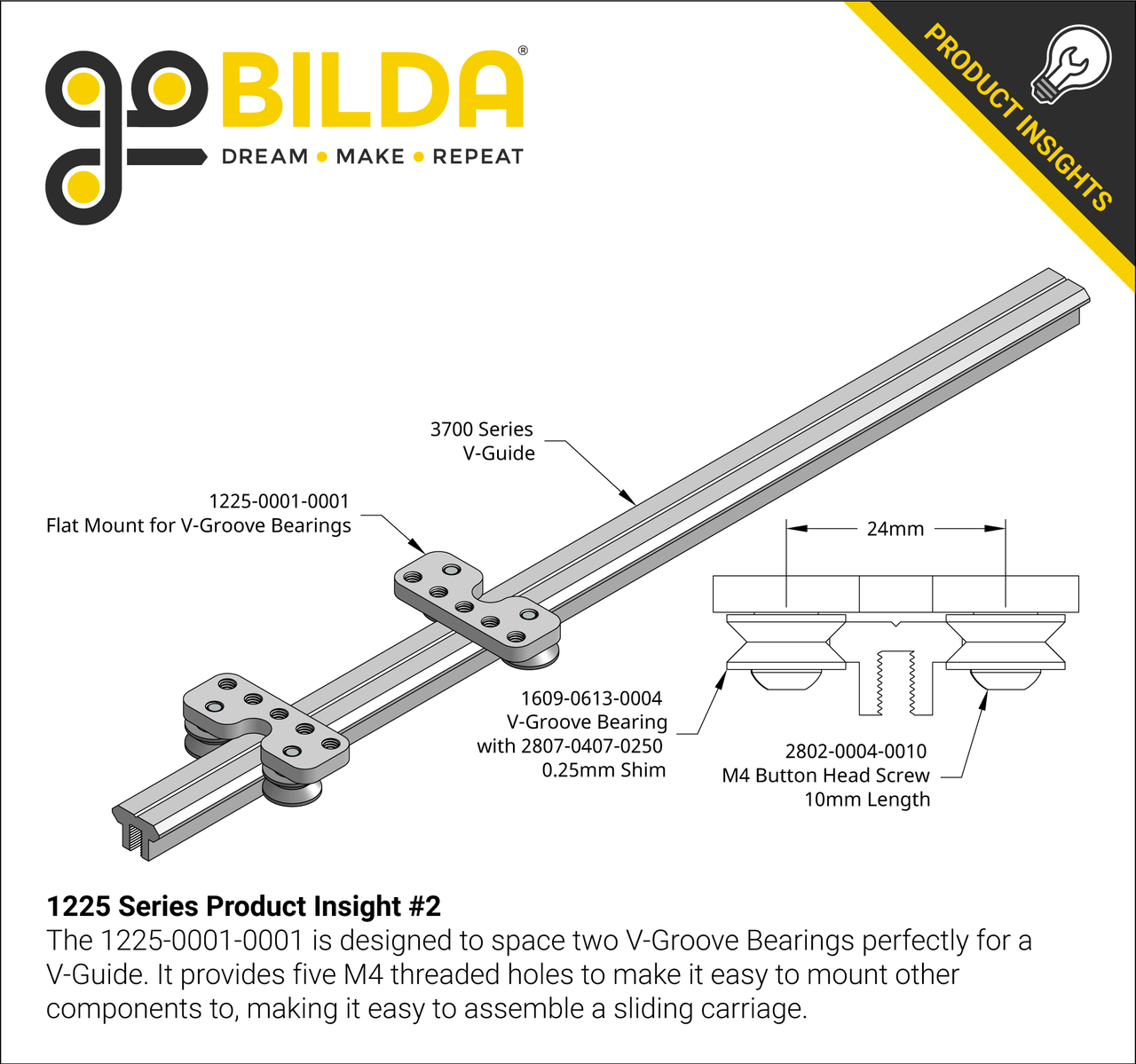 This Flat Mount provides threaded holes spaced 24mm apart so that V-Groove Bearings can be mounted the proper distance from one another to run on V-Guide. The additional row of threaded holes are to give you numerous mounting options. Having two independent mounts gives you the freedom to pick the distance between the pairs of V-Groove Bearings. Put them close together for maximum travel or spread them apart to counteract the forces that a long moment arm may be applying to your assembly.
