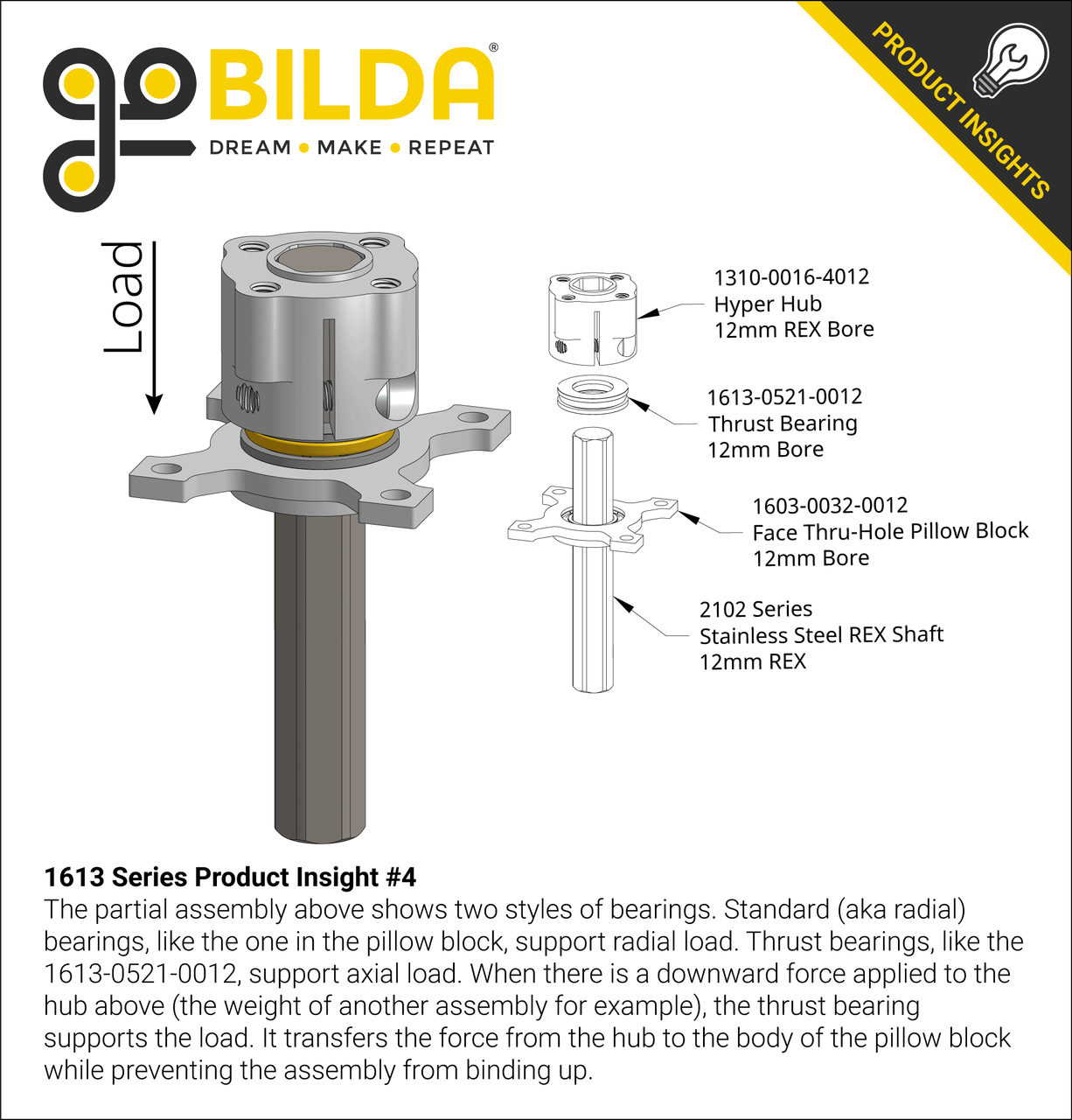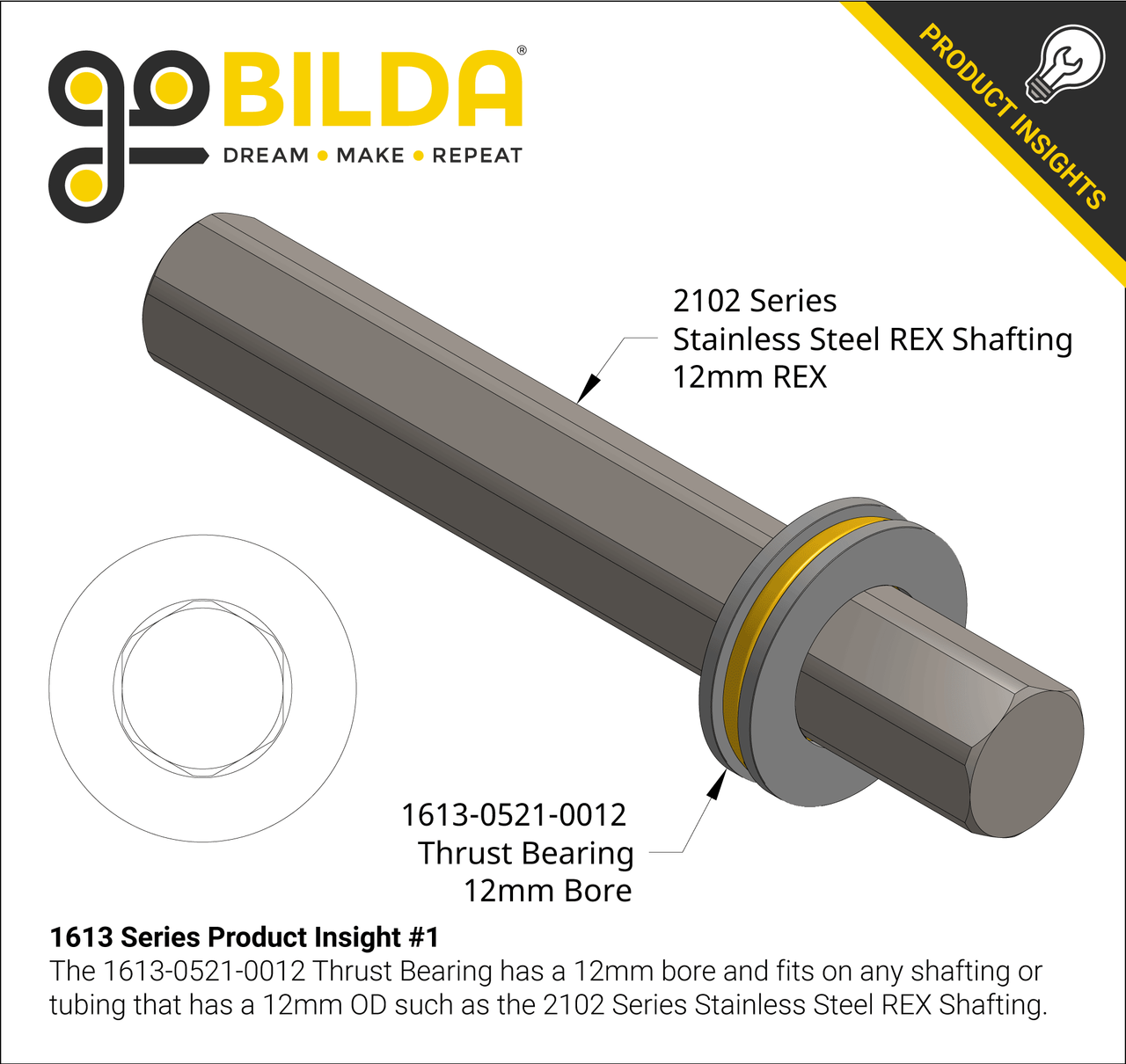 Our 12mm thrust bearings are compatible with 12mm round shafting as well as 12mm REX shafting. Do your assembly a favor by isolating the axial load using these thrust bearings.