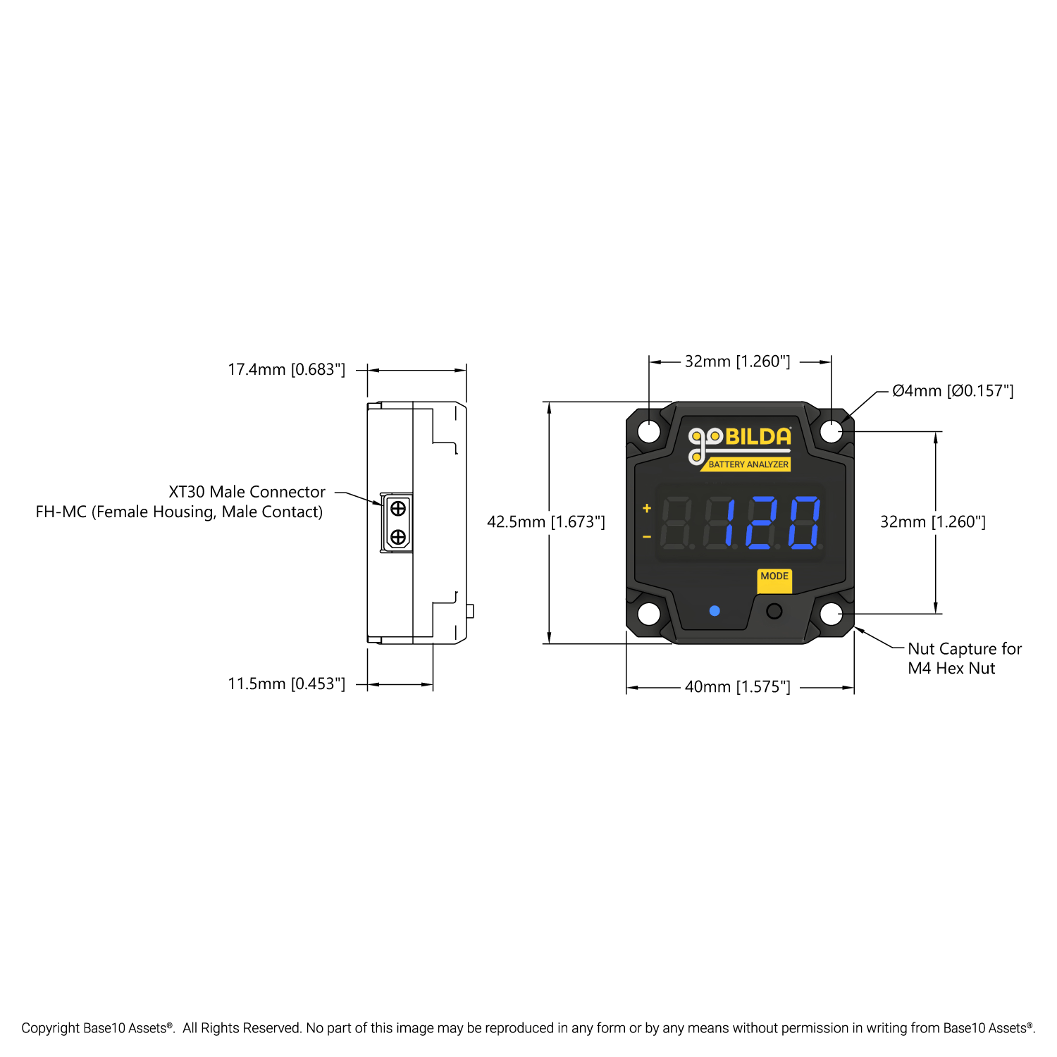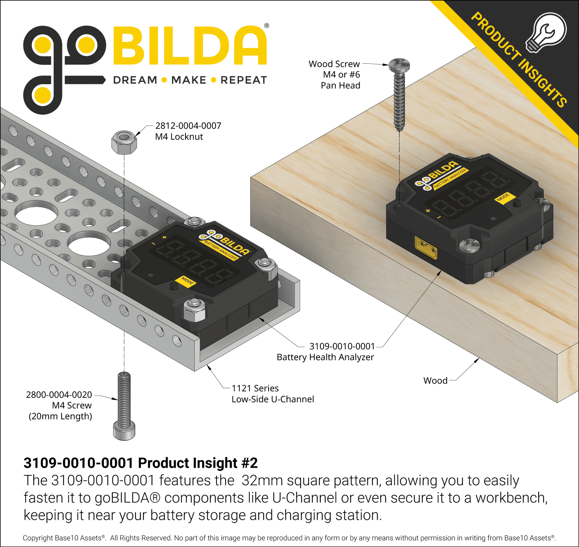 Thru-holes on the 32mm goBILDA® square pattern allow you to fasten the Battery Health Analyzer to your workstation with M4 hardware.