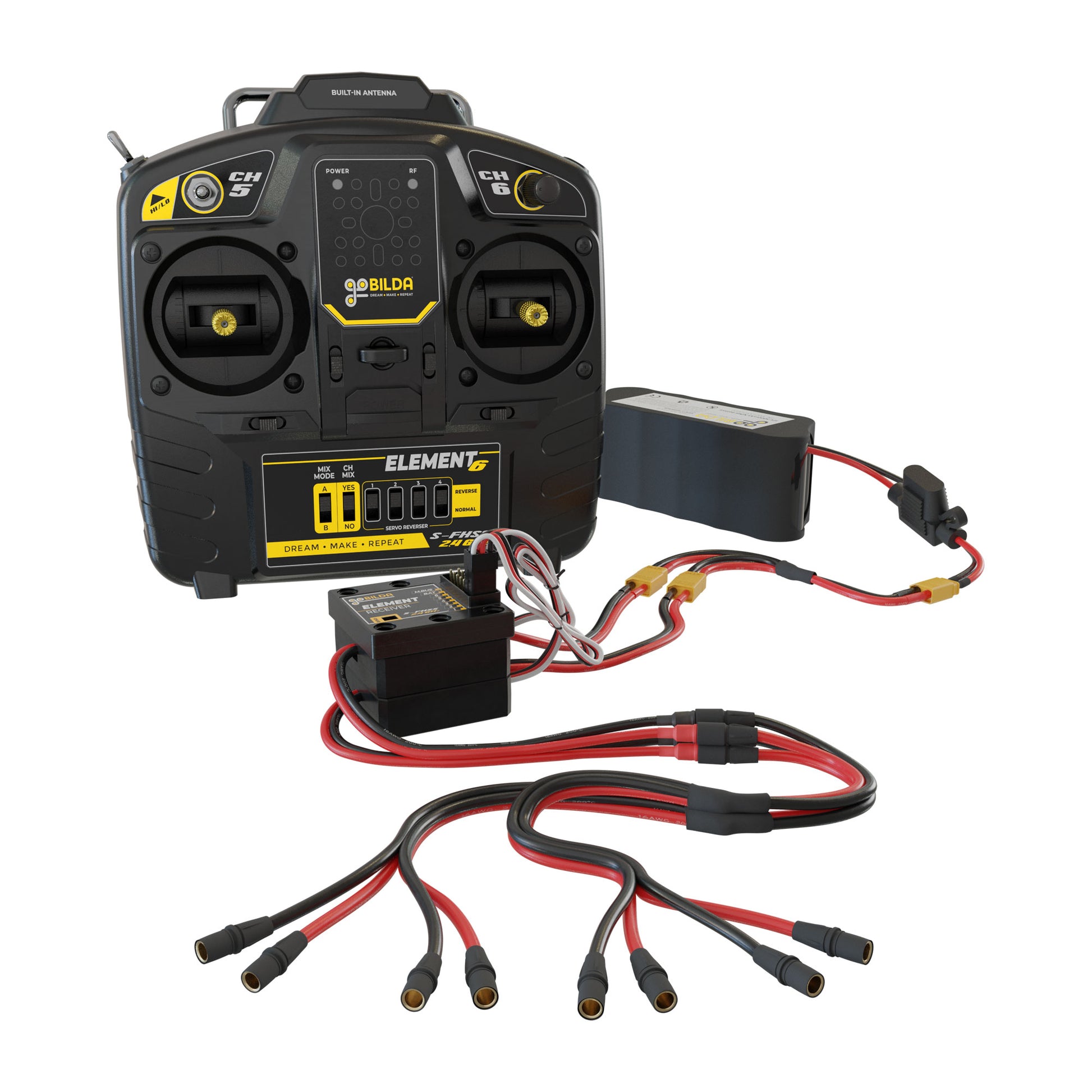 The transmitter and receiver of the tried-and-true Element-6 Radio Control System allow you to operate the two included motor controllers with ease.