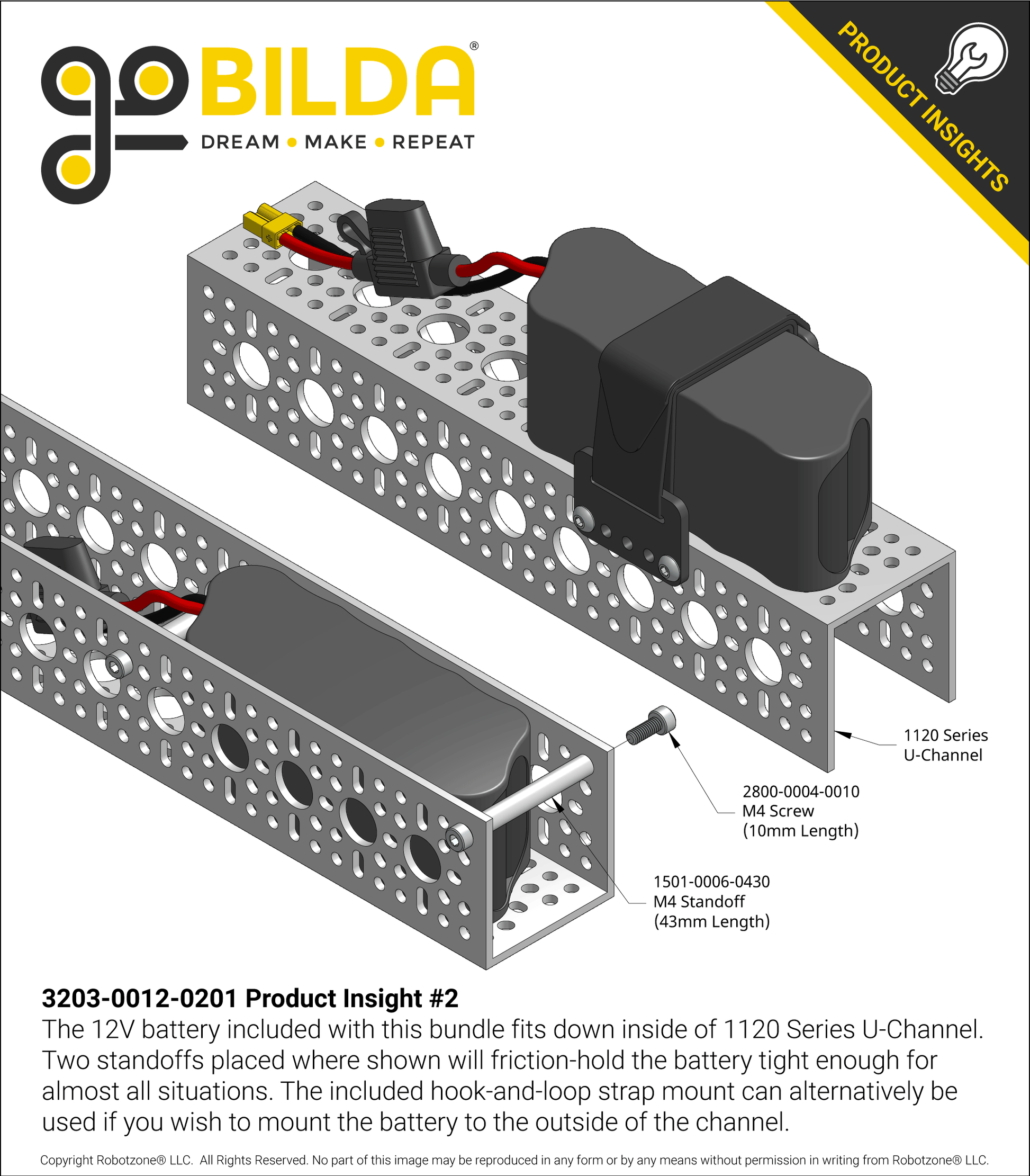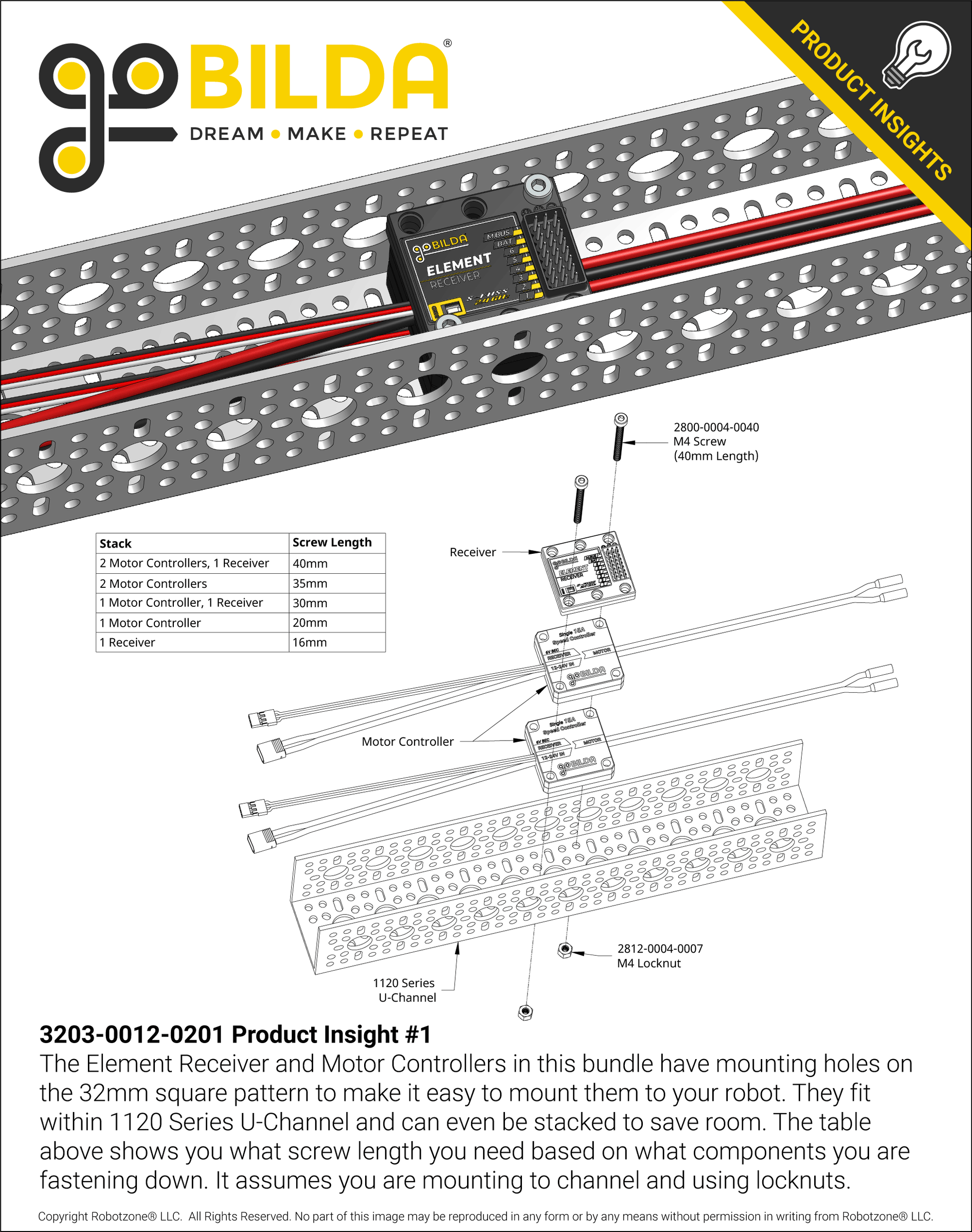 The receiver and motor controllers each have thru-holes on the goBILDA® 32mm square pattern. This makes it easy to bolt them to your build. We've included hardware (two locknuts and two screws) of the perfect length to fasten all three in a stack to goBILDA® channel.