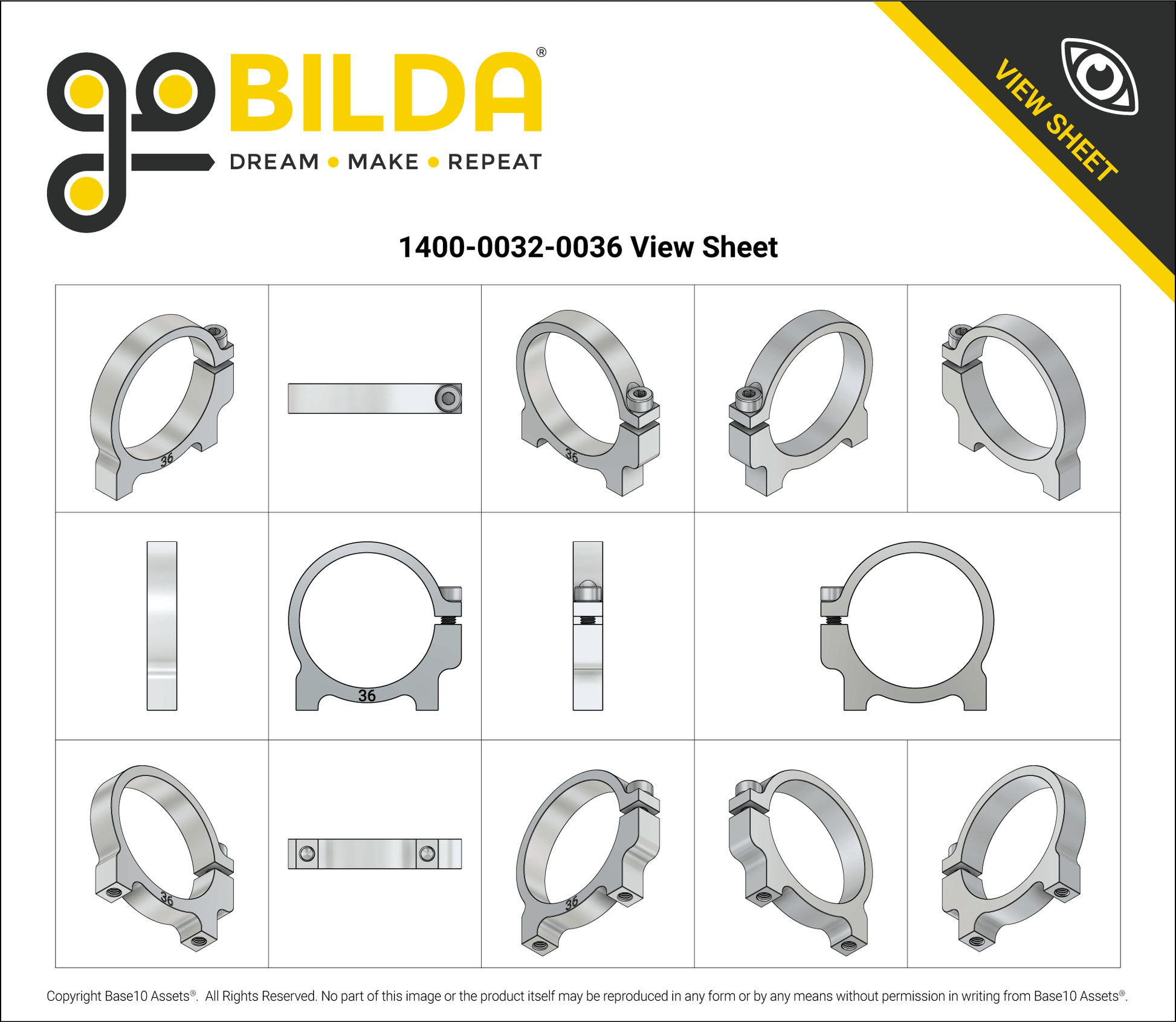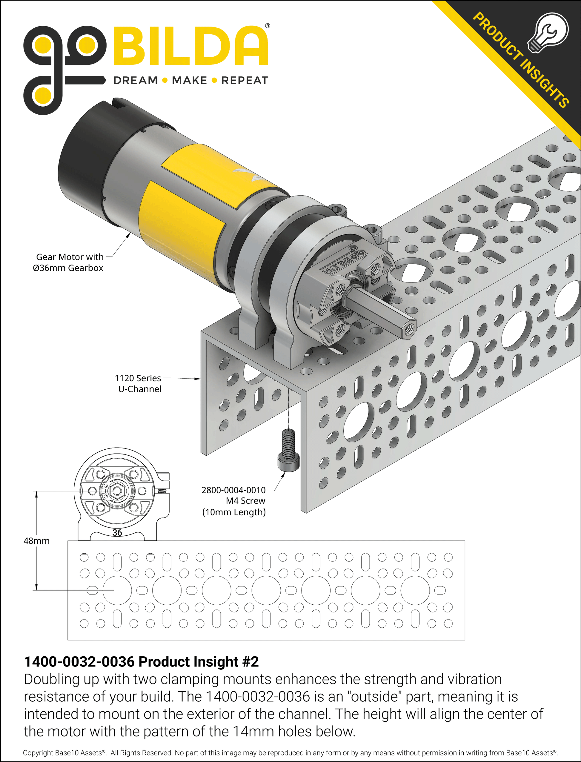 Fasten a 36mm diameter gear motor to your robot chassis using this mount. The clamping mount measures 24mm from base to center, providing a plethora of gear ratio options while staying on the 48mm center to center dimension.