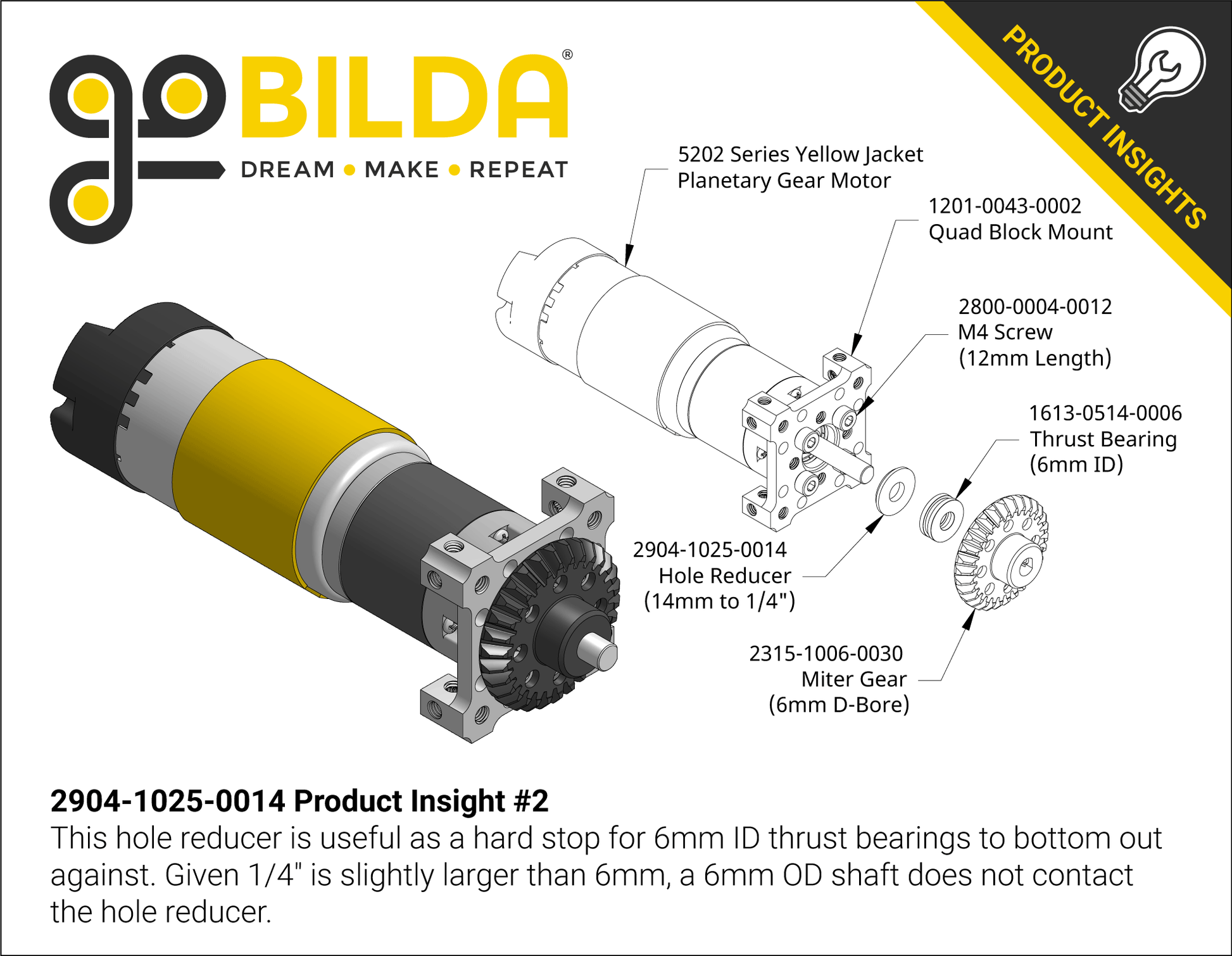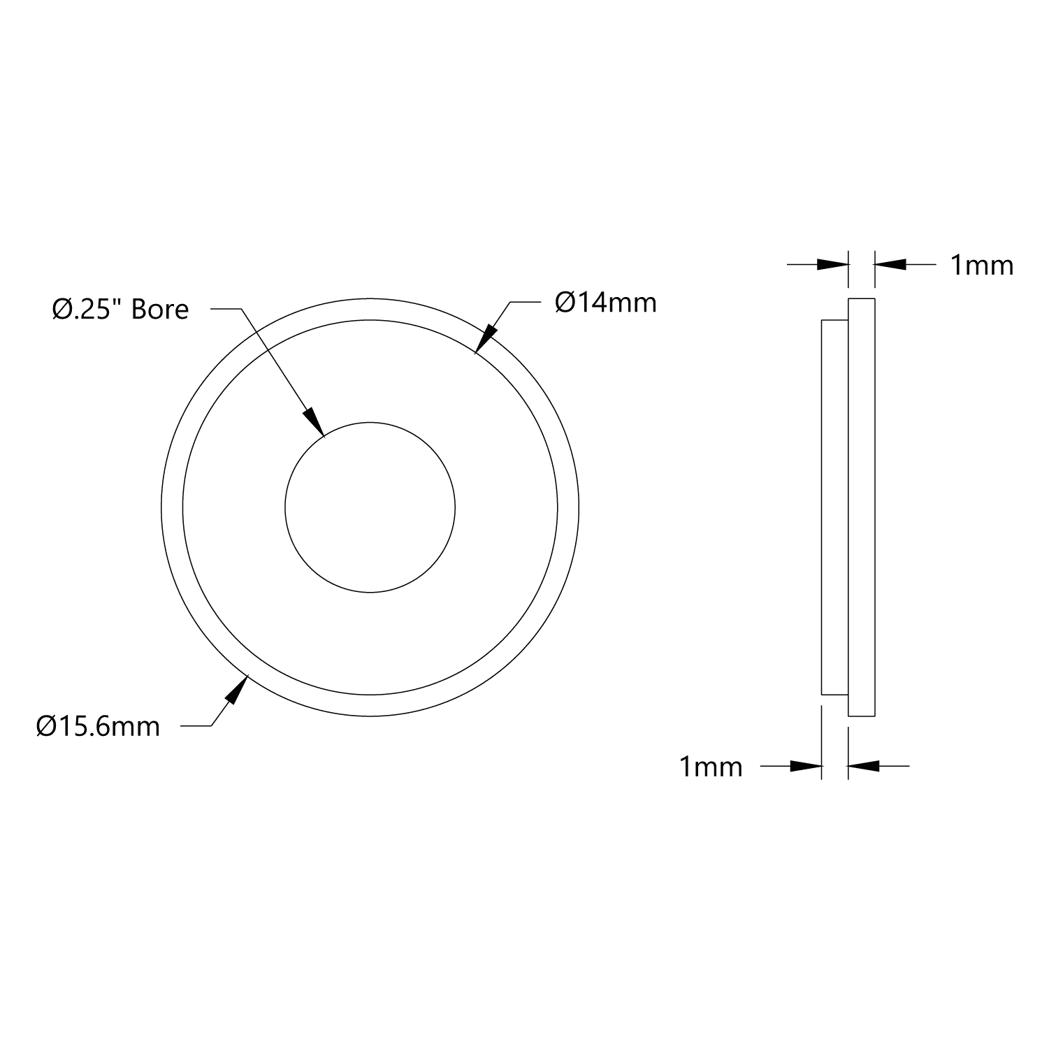 This 14mm to ¼” hole reducer allows you to integrate components that use imperial hardware with goBILDA. For example, much of the camera market is based around ¼-20 hardware, from tripods to suction cups to camera mounts and plates. These reducers can be used individually on the reverse side of the item that you’re attaching so that, when the ¼-20 bolt that passes through is tightened down, it sandwiches the channel or component that it is resting within. Alternatively, they can be used in pairs, one on each side, in situations where the item that you’re attaching doesn’t provide adequate surface area to create that ‘sandwich’. Given the adaptors have a 1mm protrusion, two can be used on a channel, leaving 0.5mm between the surfaces so that they can provide excellent clamping force when the screw passing through is tightened.
