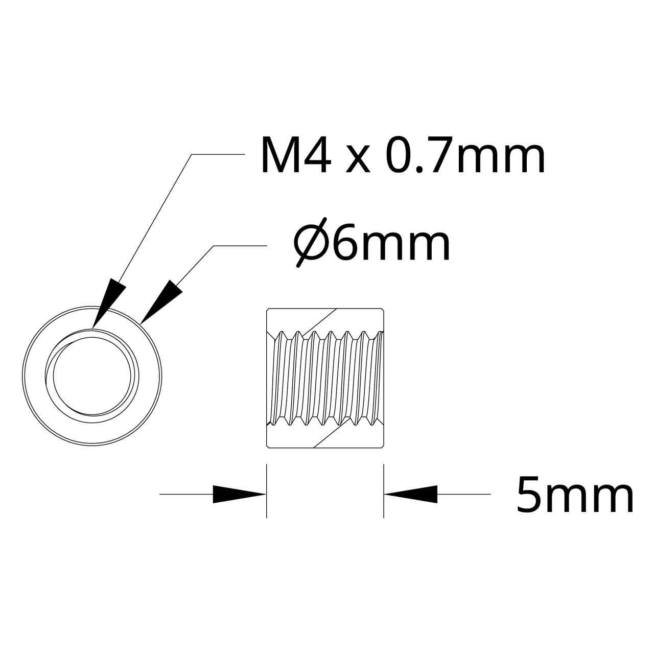 5mm length standoffs can be used as a fastener in a corner or space with low clearance, a shoulder on an M4 screw, a shaft for a 4mm ID bearing, or an adjustable stop on a piece of threaded rod operating a control surface.