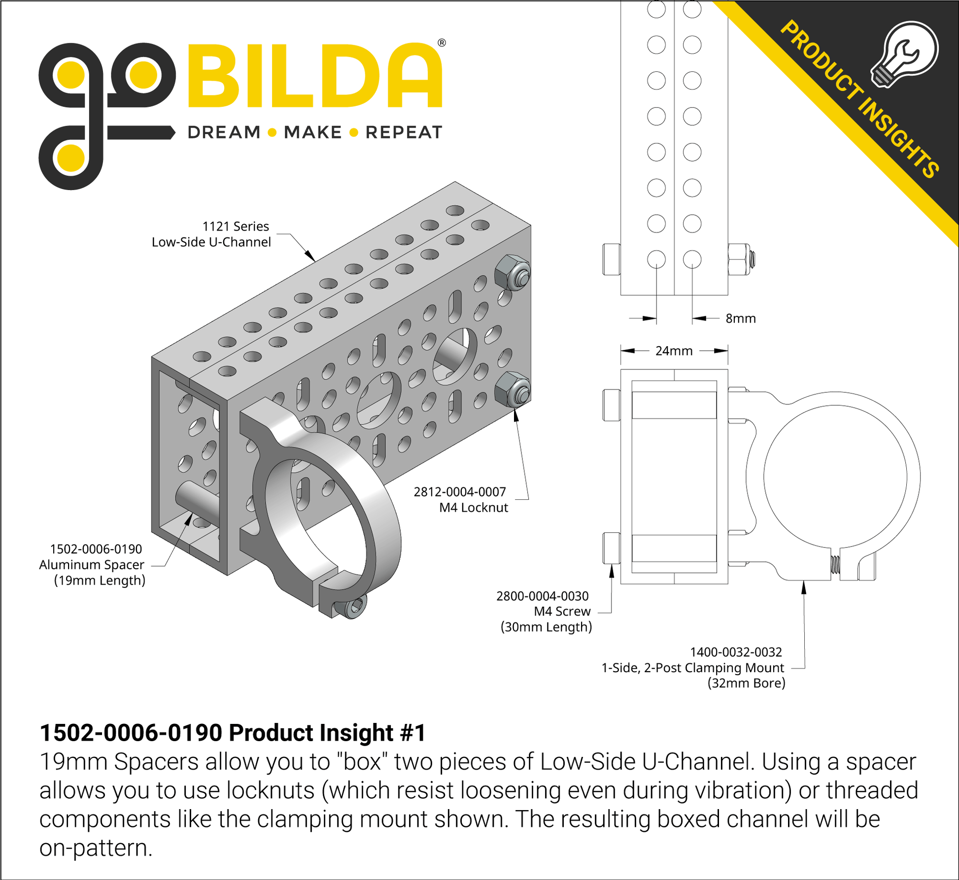19mm length spacers allow you to box 1121 Series Low-Side U-Channel together given the inside dimension of each piece of channel is 9.5mm. Boxing channel with these spacers creates a very stout framework while minimizing real estate.