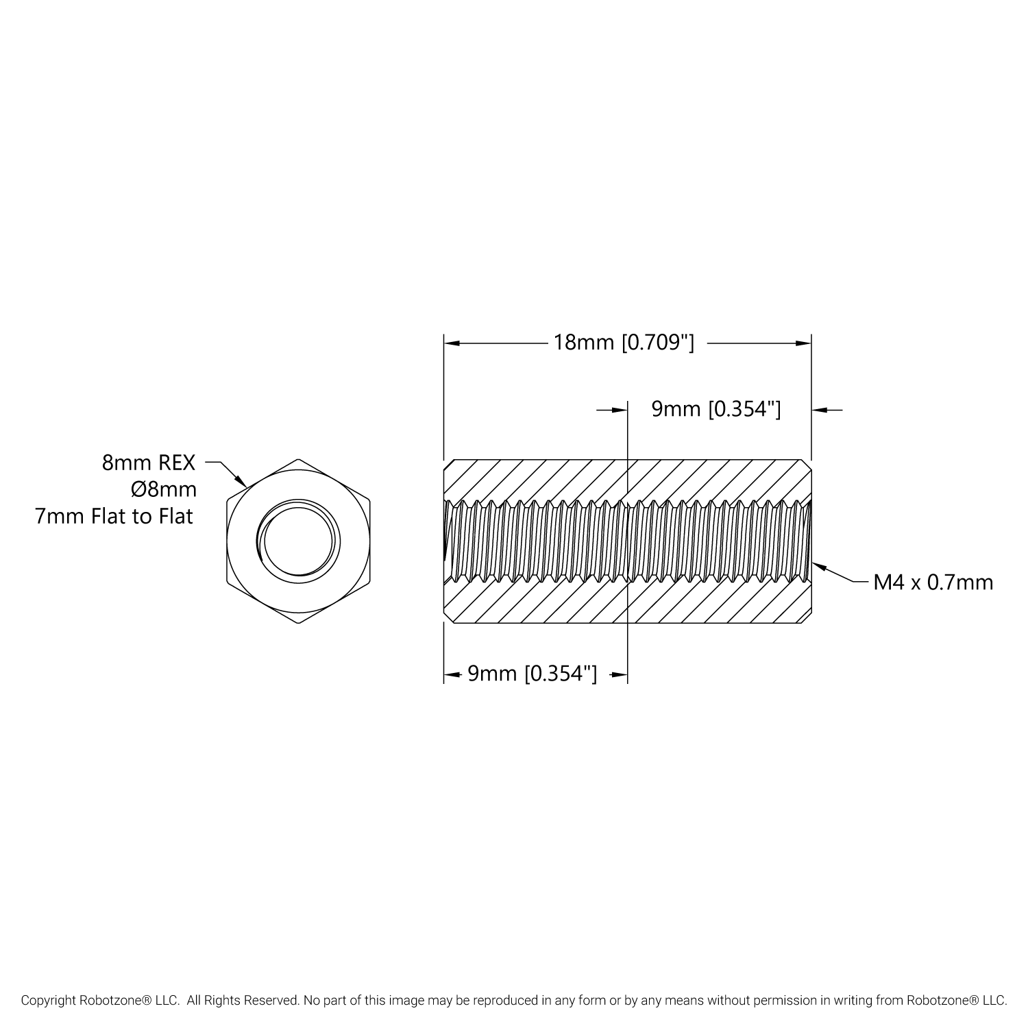 The 18mm length, M4-threaded, 8mm REX™ Standoff provides clearance, adjusts distances between parallel parts, and reinforces structures. You can also use its threaded holes to mount other parts to your builds! And thanks to its 8mm REX™ profile measuring 7mm flat-to-flat like a hex nut, you can hold it with a 7mm wrench during assembly and disassembly.