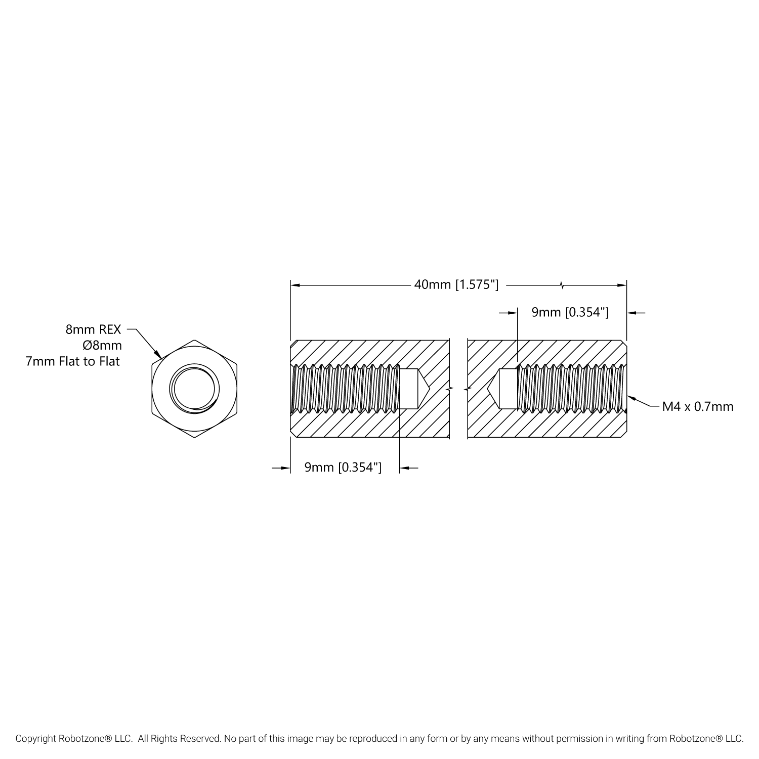 The 40mm length, M4-threaded, 8mm REX™ Standoff provides clearance, adjusts distances between parallel parts, and reinforces structures. You can also use its threaded holes to mount other parts to your builds! And thanks to its 8mm REX™ profile measuring 7mm flat-to-flat like a hex nut, you can hold it with a 7mm wrench during assembly and disassembly.