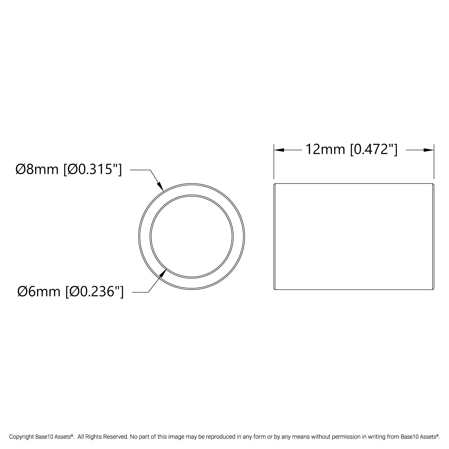 This 12mm length, 8mm OD spacer is able to slip over an 6mm shaft—whether that’s a round shaft or a D-shaft—to create space between components. When you run it against a bearing, the spacer will only contact the bearing’s inner race. This allows your project to rotate smoothly.