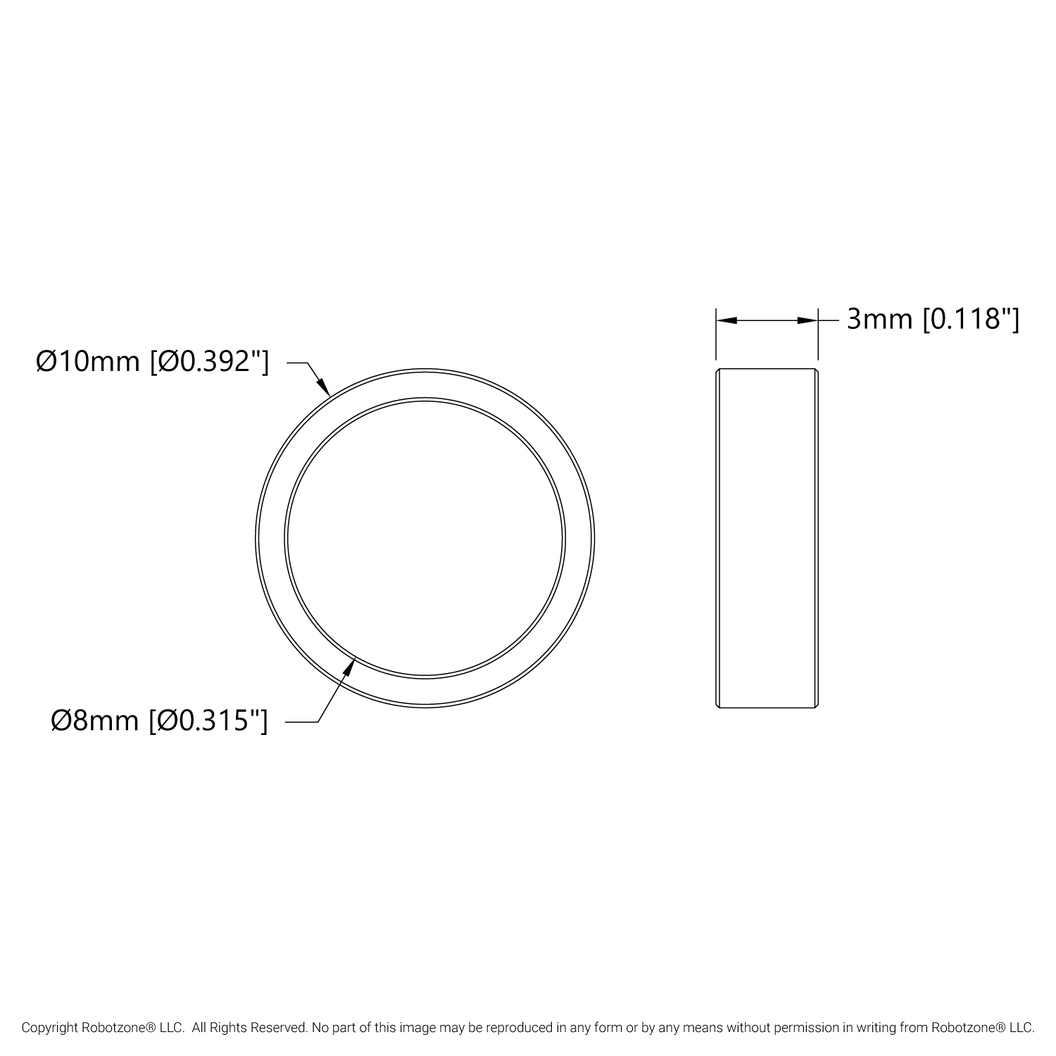 This 3mm length, 10mm OD spacer is able to slip over an 8mm shaft—whether that’s a round shaft, REX shaft, threaded rod, or even a lead screw—to create space between components. When you run it against a bearing, the spacer will only contact the bearing’s inner race. This allows your project to rotate smoothly.