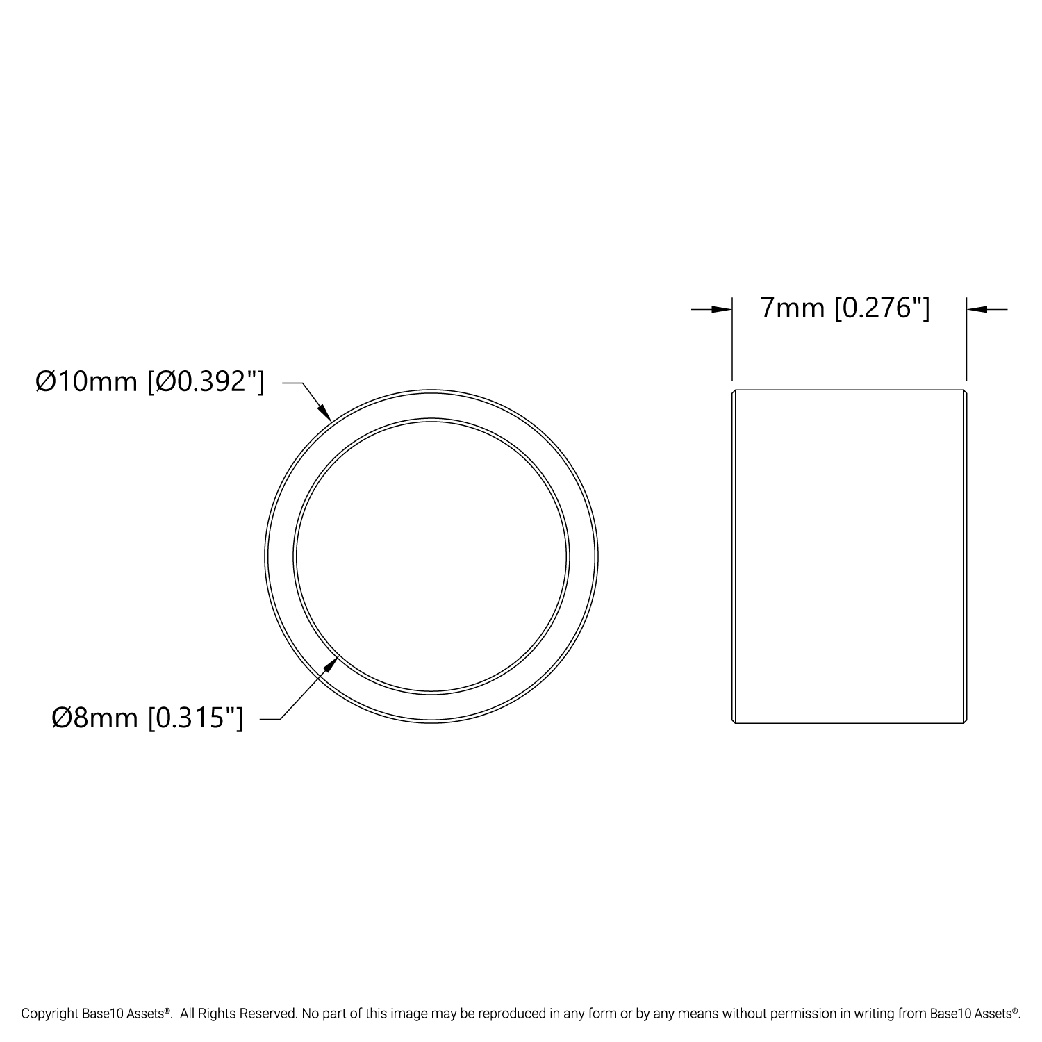 This 7mm length, 10mm OD spacer is able to slip over an 8mm shaft—whether that’s a round shaft, REX shaft, threaded rod, or even a lead screw—to create space between components. When you run it against a bearing, the spacer will only contact the bearing’s inner race. This allows your project to rotate smoothly.