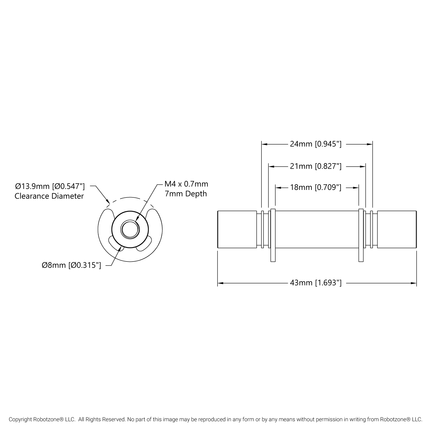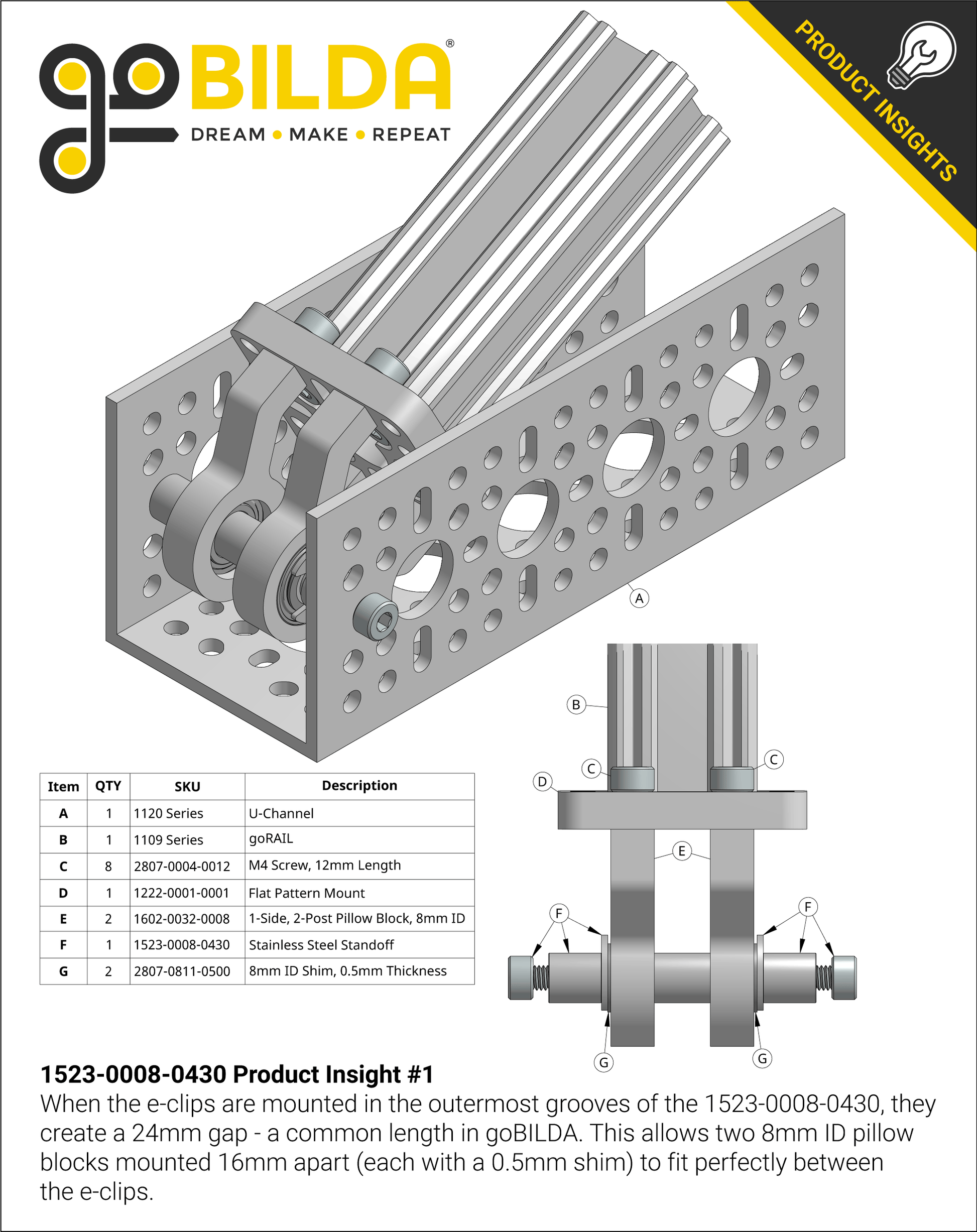 This 43mm Length, 8mm OD Steel Standoff is a stout way to join two components or tie together the sidewalls of 1120 Series U-Channel. It comes with two E-clips that you can clip onto any of its several E-clip groove locations to axially constrain 8mm bore bearings.
