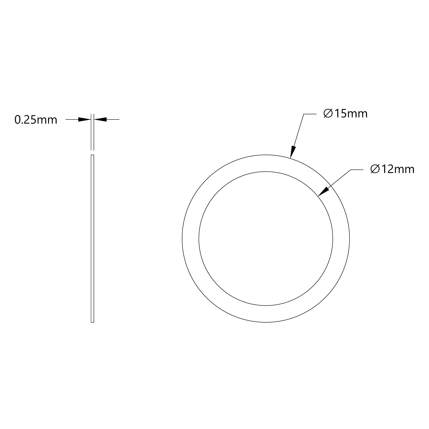 These 0.25mm thick stainless shims are intended to provide a small amount of necessary space between a 12mm bearing, and the next component in your assembly. Since the inner race and outer race of most bearings share the same thickness, there’s potential for an item that extends over the outer race to scrape as it rotates. By adding a shim, that part can rest against the shim and rotate freely without contacting the outer race.