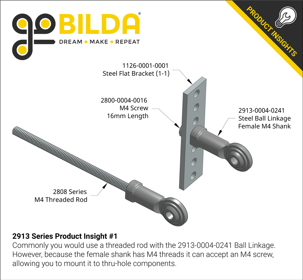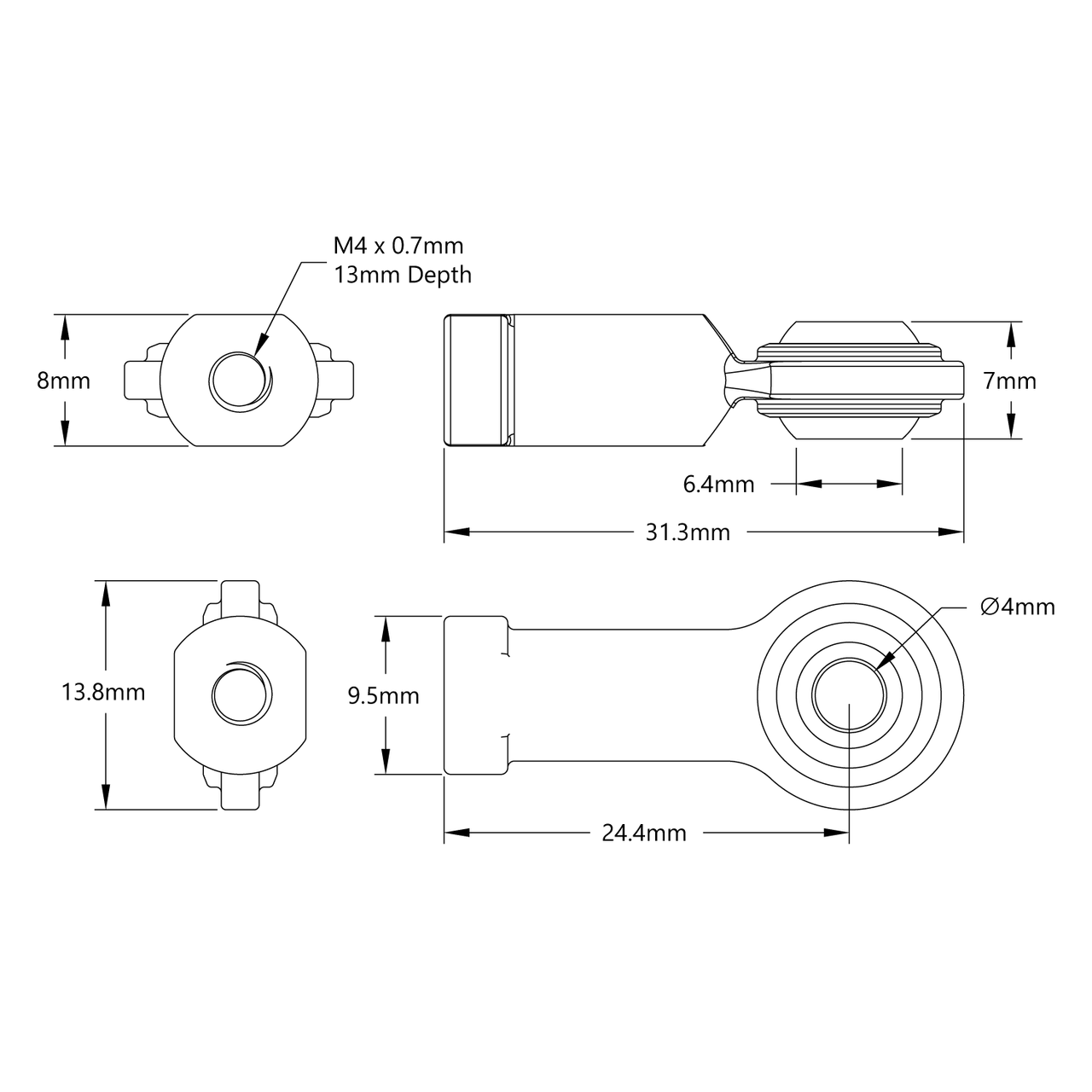 This steel ball linkage has an M4 threaded female shank so that you can attach it to an M4 screw, threaded rod or ball linkage which has a male shank. The all steel construction makes this ball linkage great for high-demand applications.