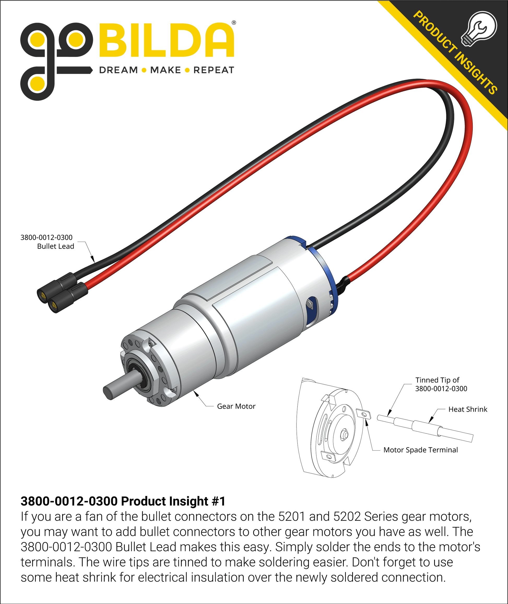 This bullet lead consists of 300mm length, 16AWG, bonded wire that is terminated in 3.5mm (FH-MC) bullet connectors on one end and bare wires on the other. This is the same connector style as found on the end of the wires on our Yellow Jacket Gear Motors. If you have a project that you want to wire up custom motors, or just have a project that requires a high quality connection in a compact form-factor, this lead may fit the bill.
