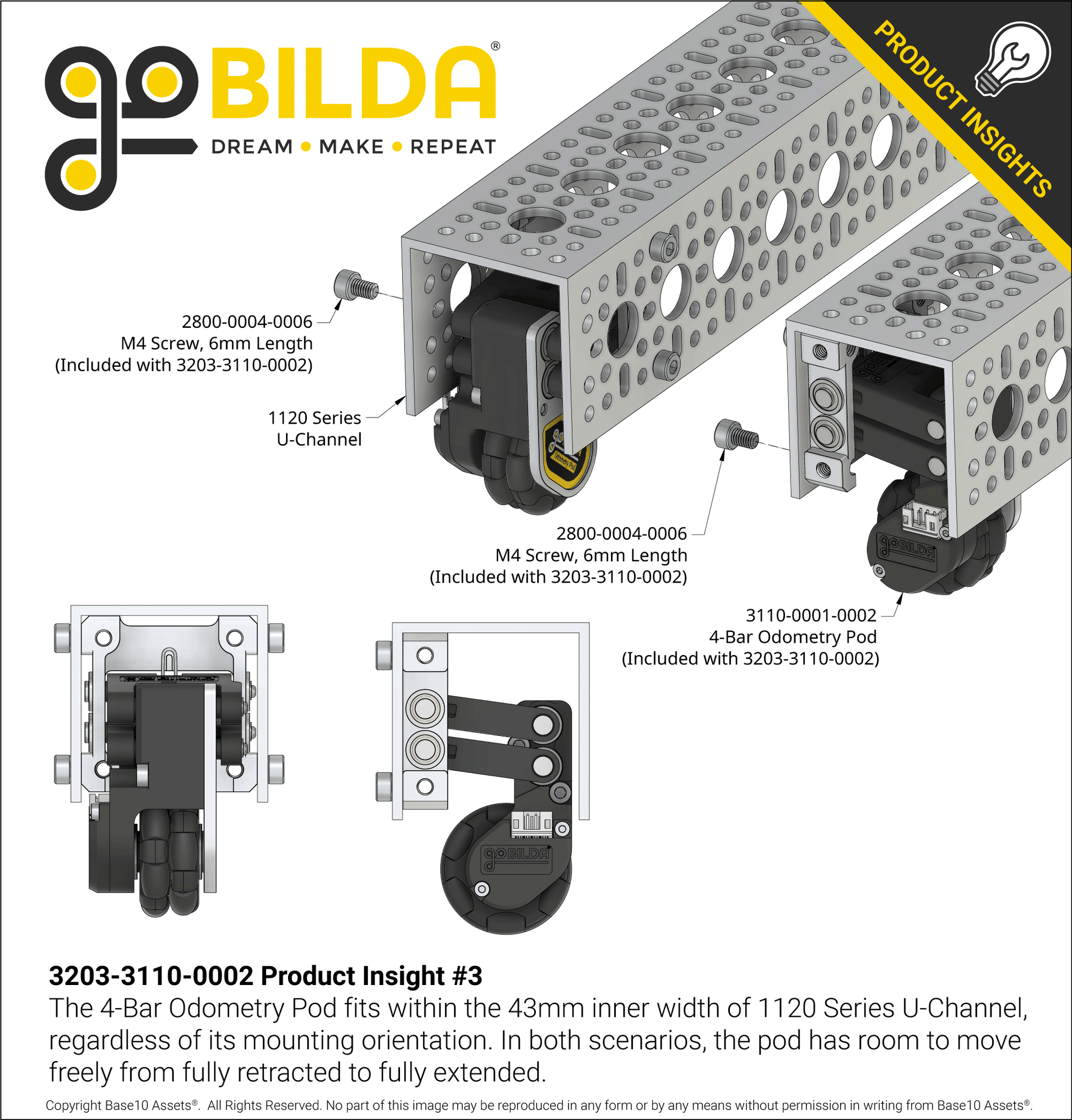 The 4-Bar Odometry Pods in this Pack feature a compact profile for mounting within 43mm x 43mm profiles, such as inside 1120 Series U-Channel. The awesome spring tension is such that your 4-Bar Pods can achieve a nearly linear downforce as your robot travels!