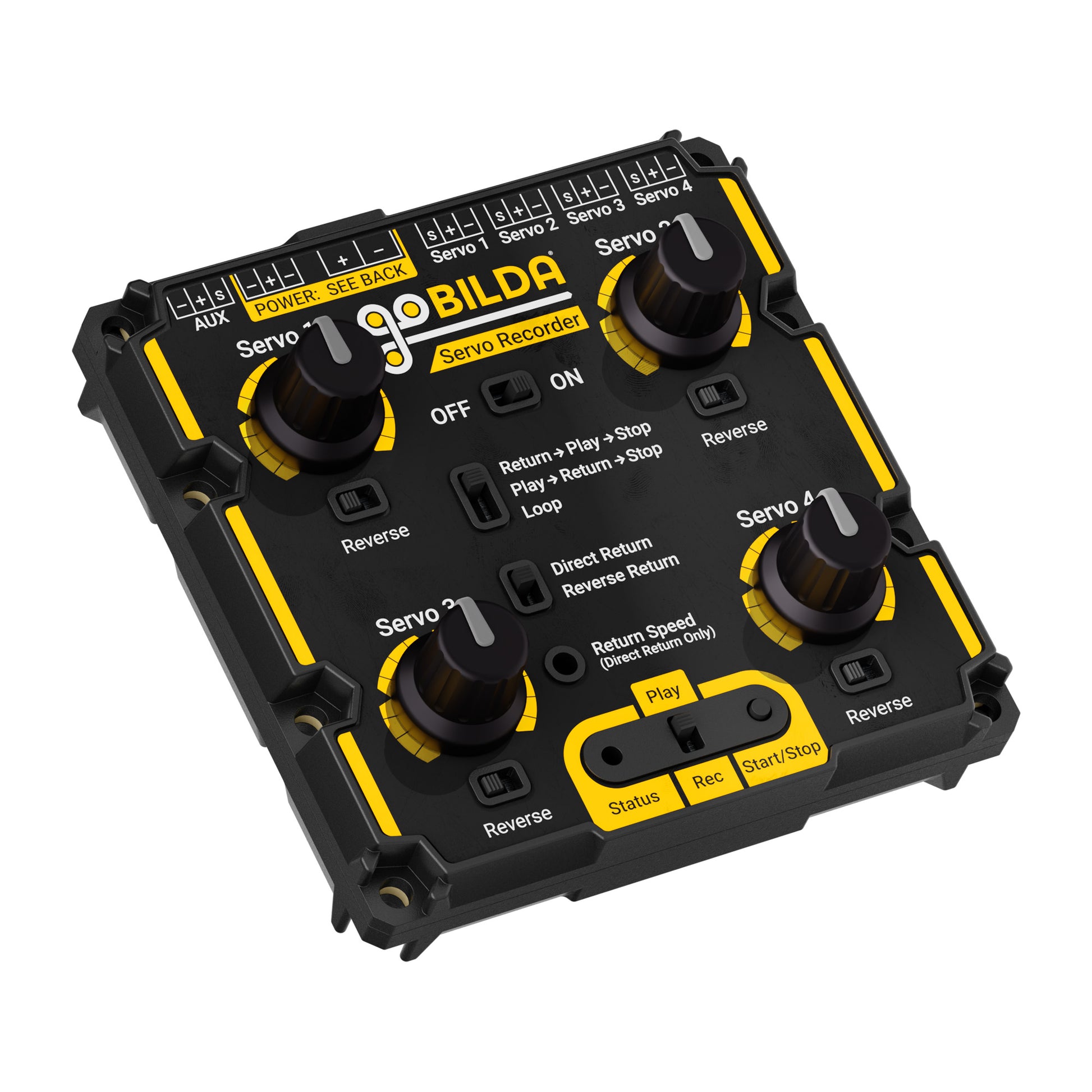 Different playback and position return options are selectable via the middle switches. These allow you to choose the method and speed at which servos return to their initial positions, as well as whether or not your recording stops or repeats. You can learn about these options and more in the User Manual.