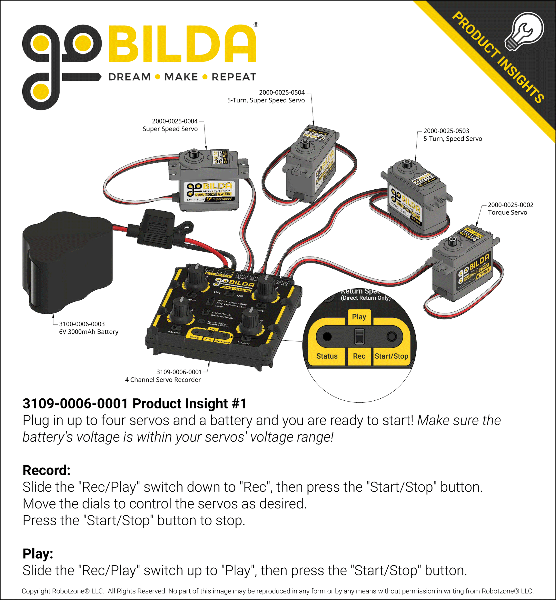 To play back the recording, move the “Play/Rec” switch to “Play”, then push the “Start/Stop” button. Your servos will dance to every direction you provided them. All you need to do is sit back and watch them go!