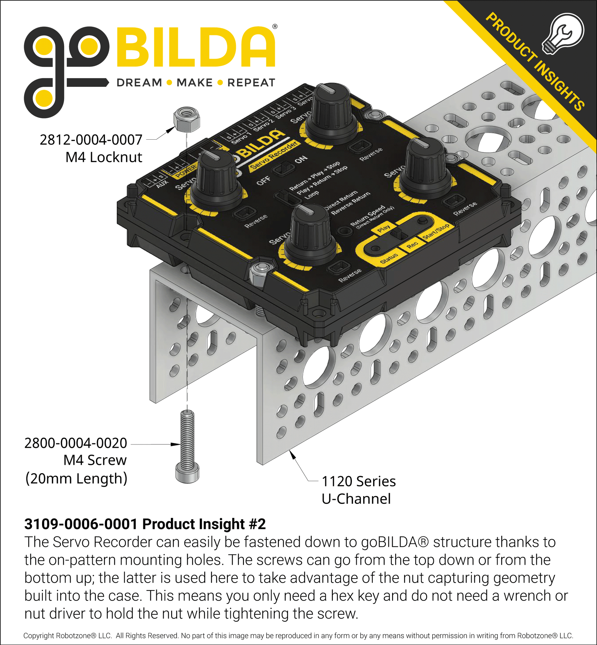 Thru-holes on the goBILDA® pattern allow you to fasten the Servo Recorder to your build. The holes’ nut-capturing hex counterbores provide for easy one-tool installation!