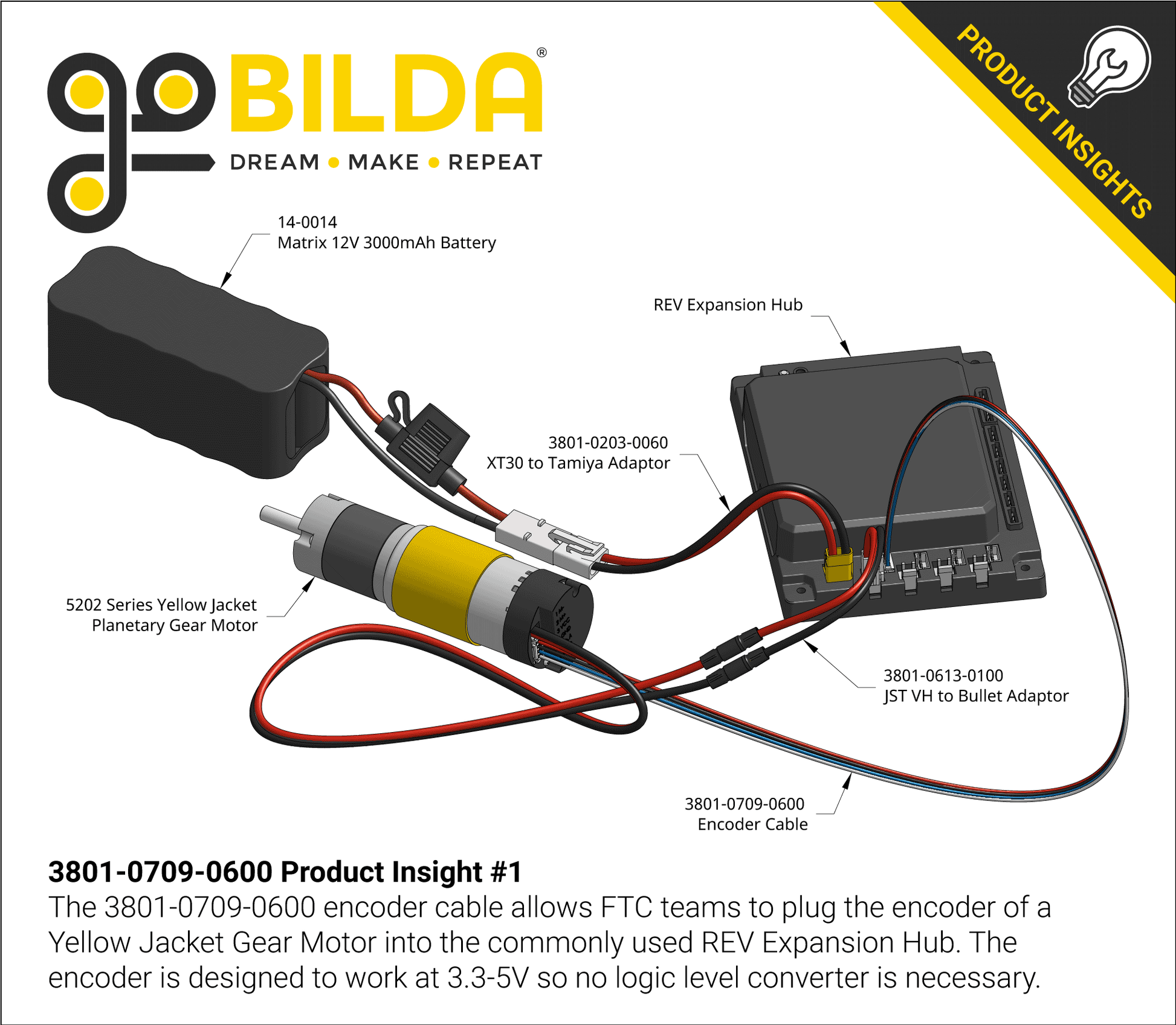 This 600mm Length JST adaptor is able to plug into the encoder found on 5000 Series Motors and 52xx Series Gear Motors, using the JST XH Series end. The remaining end is able to plug directly into the REV Robotics Expansion Hub; a controller commonly used in the FIRST Robotics FTC Challenge.