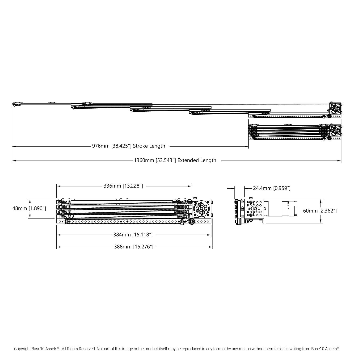 A 60 Tooth GT2 Pulley drives this kit 120mm per rotation. With a maximum travel distance of 976mm (38.4”), the kit reaches full extension at ~8.1 rotations of its motor’s shaft.