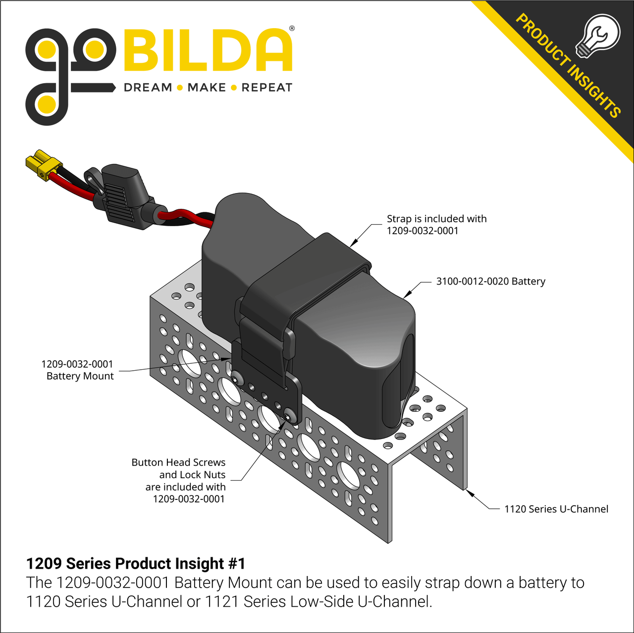 This battery mount kit comes with the necessary hardware to mount a 14-0014 or 3100-0012-0020 battery to 1120 Series U-Channel or 1121 Series Low-Side U-Channel. The acetal plastic tabs act as a loom to route the velcro cinch-strap through to secure your battery.