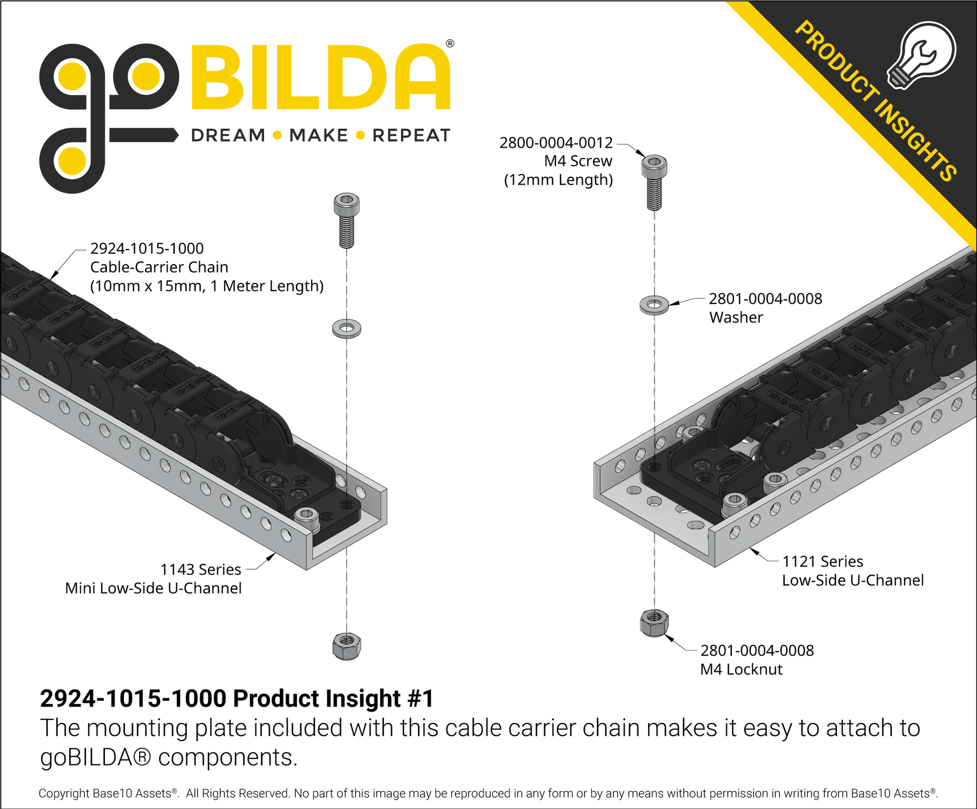 The chain opens easily to allow access to wires, and it closes securely to keep those wires right where you put them. The ends can fasten to your goBILDA® project via the included plates.