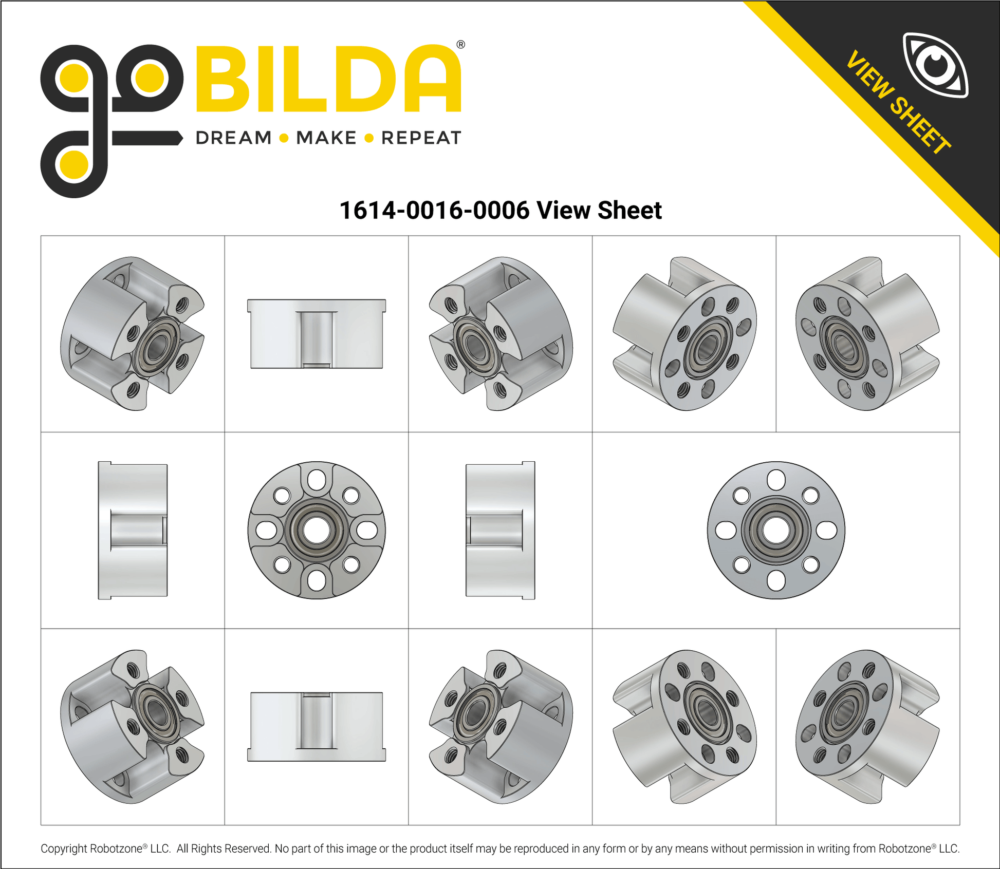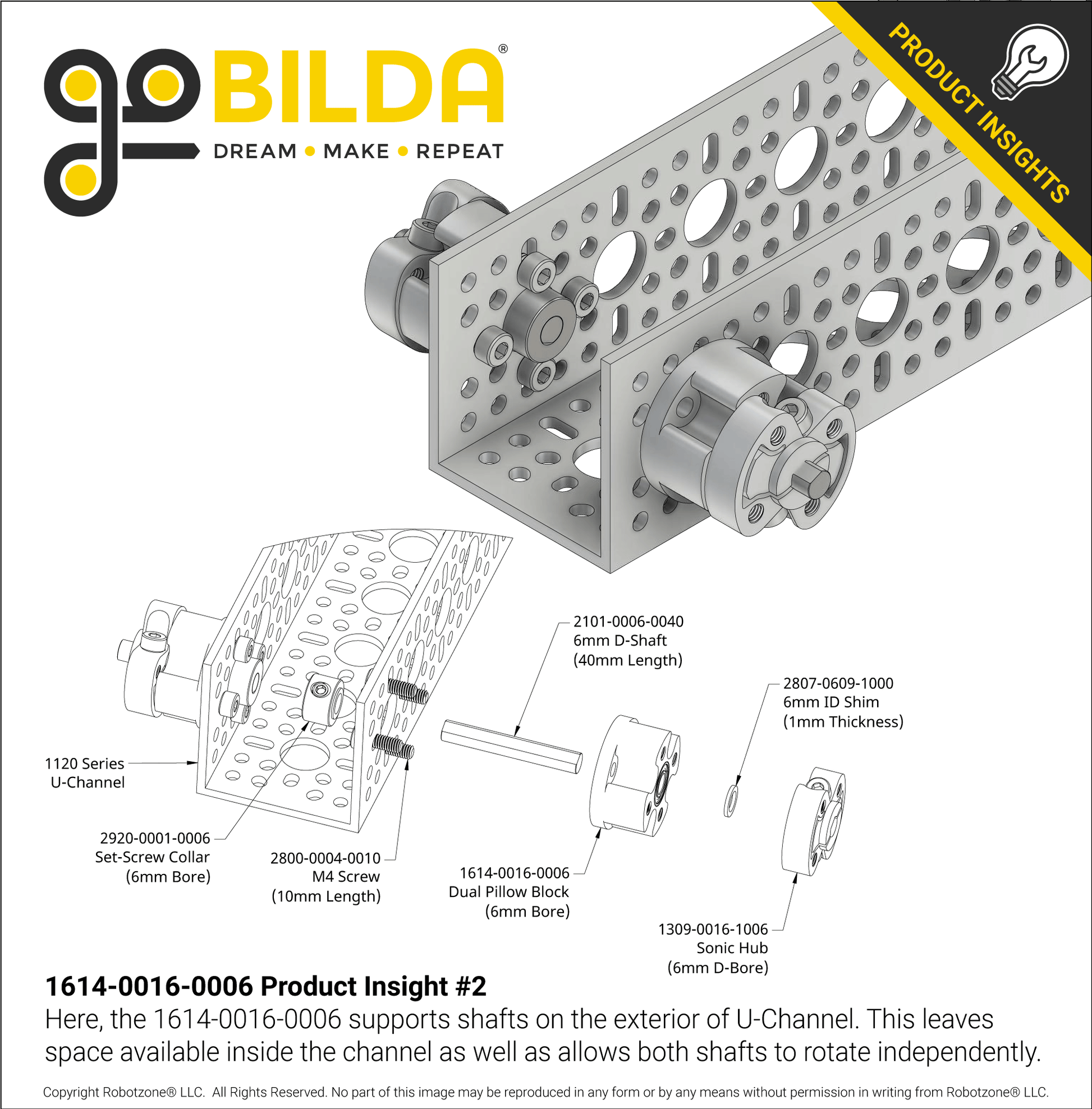 This pillow block is an all-in-one solution to provide support to a 6mm diameter round shaft or 6mm diameter D-shaft. Two bearings, as found in this Dual Bearing Pillow Block, are critical in providing shaft support when dealing with a cantilevered load on an otherwise unsupported shaft. That’s why this pillow block shines when there’s only one surface available to mount a bearing. Simply fasten it on the goBILDA® 16mm pattern using its threaded or thru-holes, and put your project in motion!