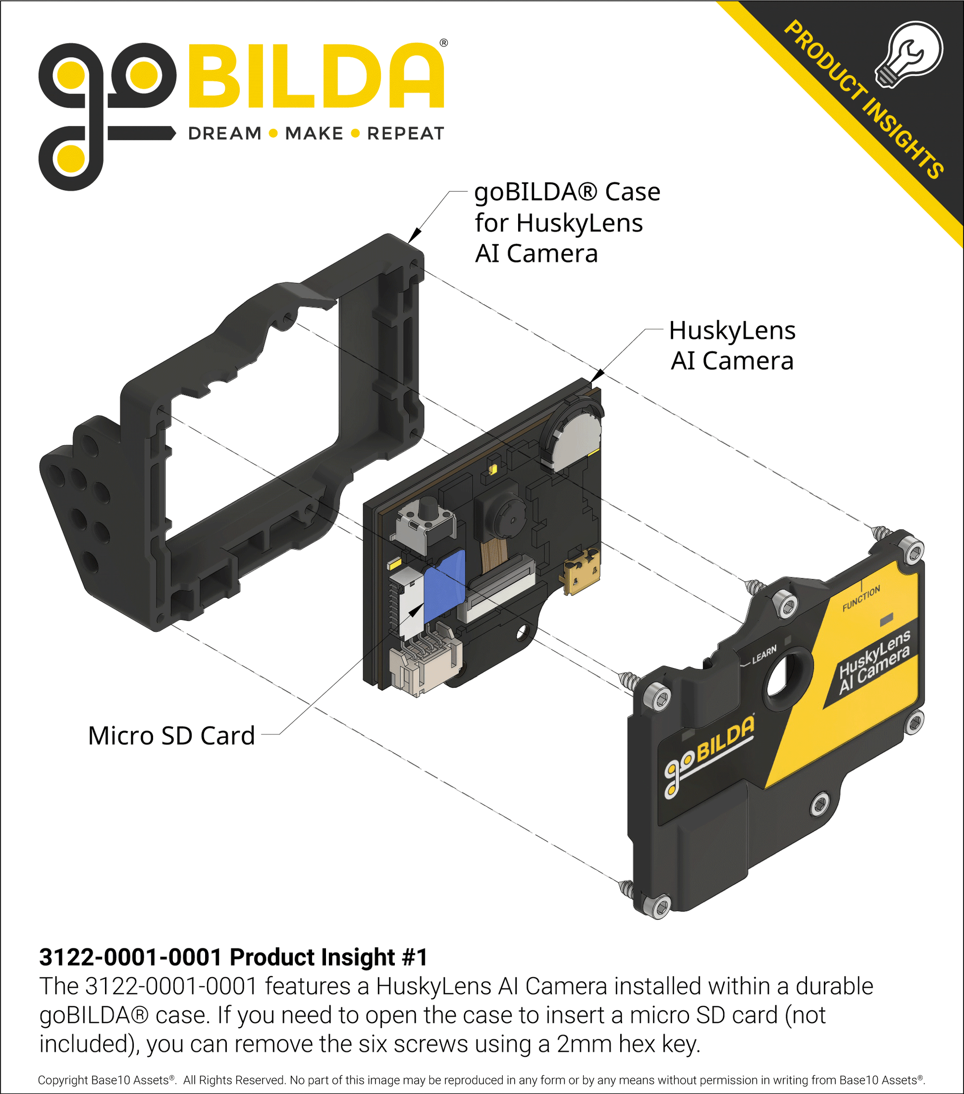 The HuskyLens Camera is an AI-powered vision sensor designed to make implementing computer vision in your robot a walk in the park. It offers baked-in tag detection alongside color and line recognition capabilities.This HuskyLens also features a goBILDA® case for easy solid attachment.