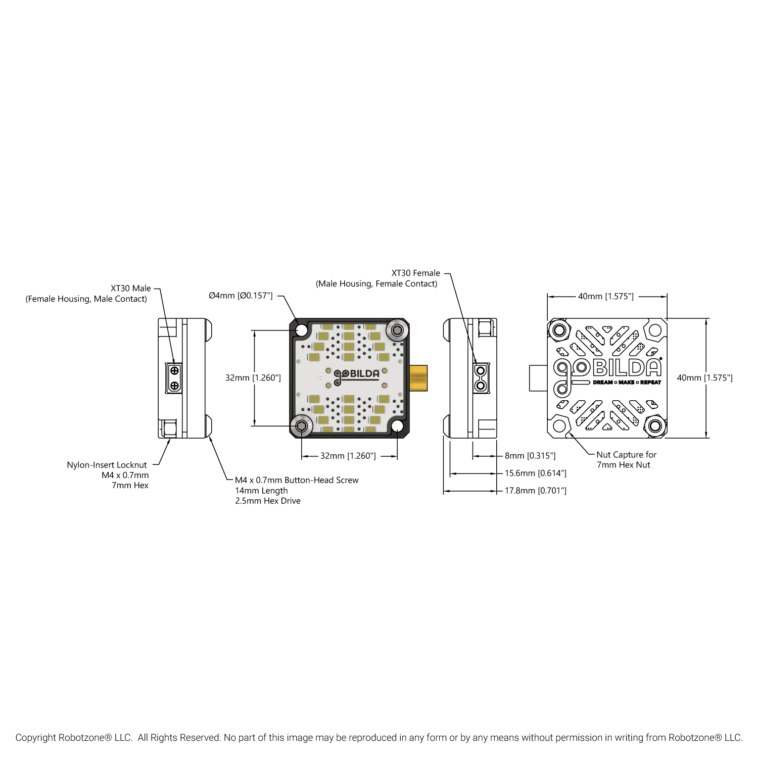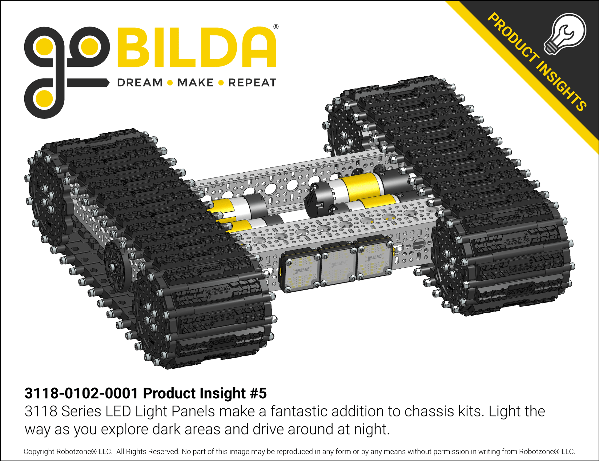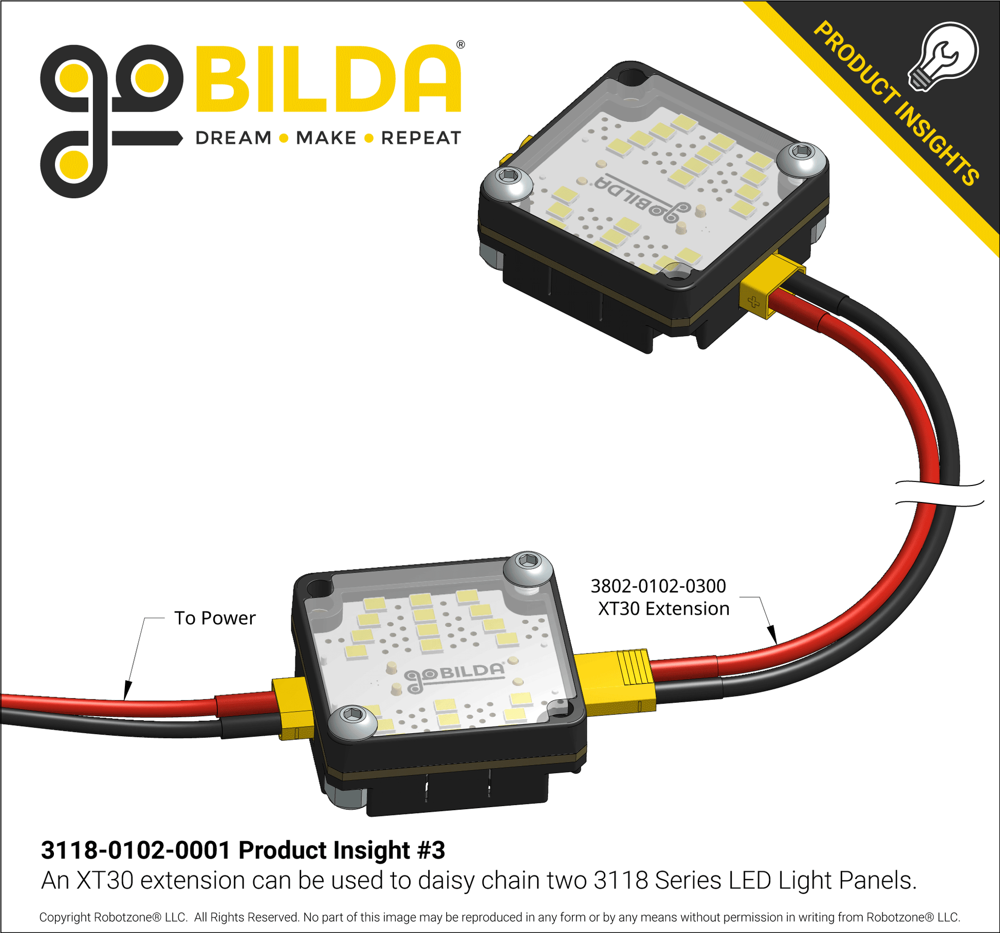 Light your way to brighter builds with the goBILDA® LED Light Panel! This brilliant block emits an extreme flood beam that illuminates everything it faces. With a compact design including XT30 input-output and mounting holes on the 32mm square pattern, it can attach to almost any goBILDA® structure to daisy-chain with other lights or send power from a 10-30VDC power source to other electrical components.