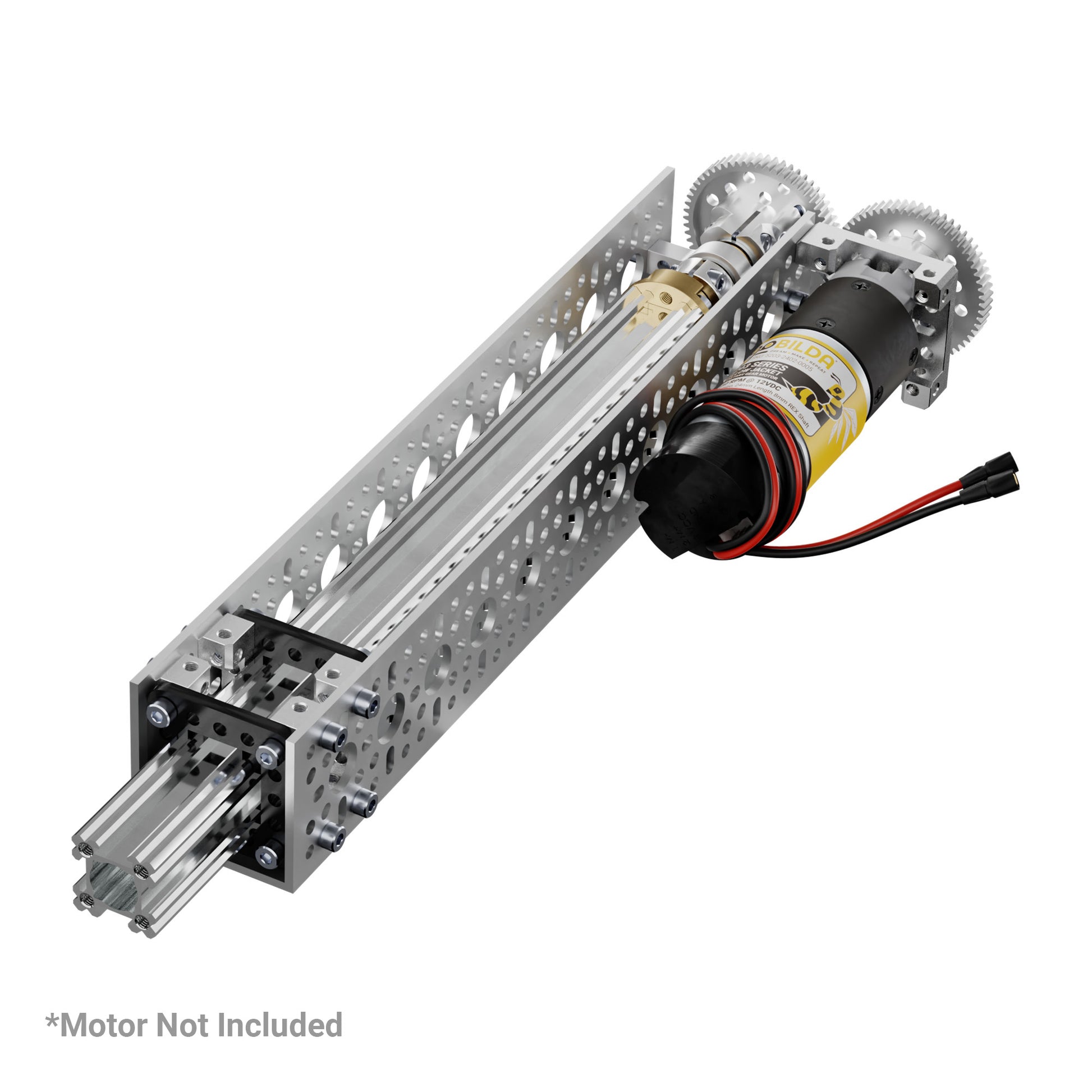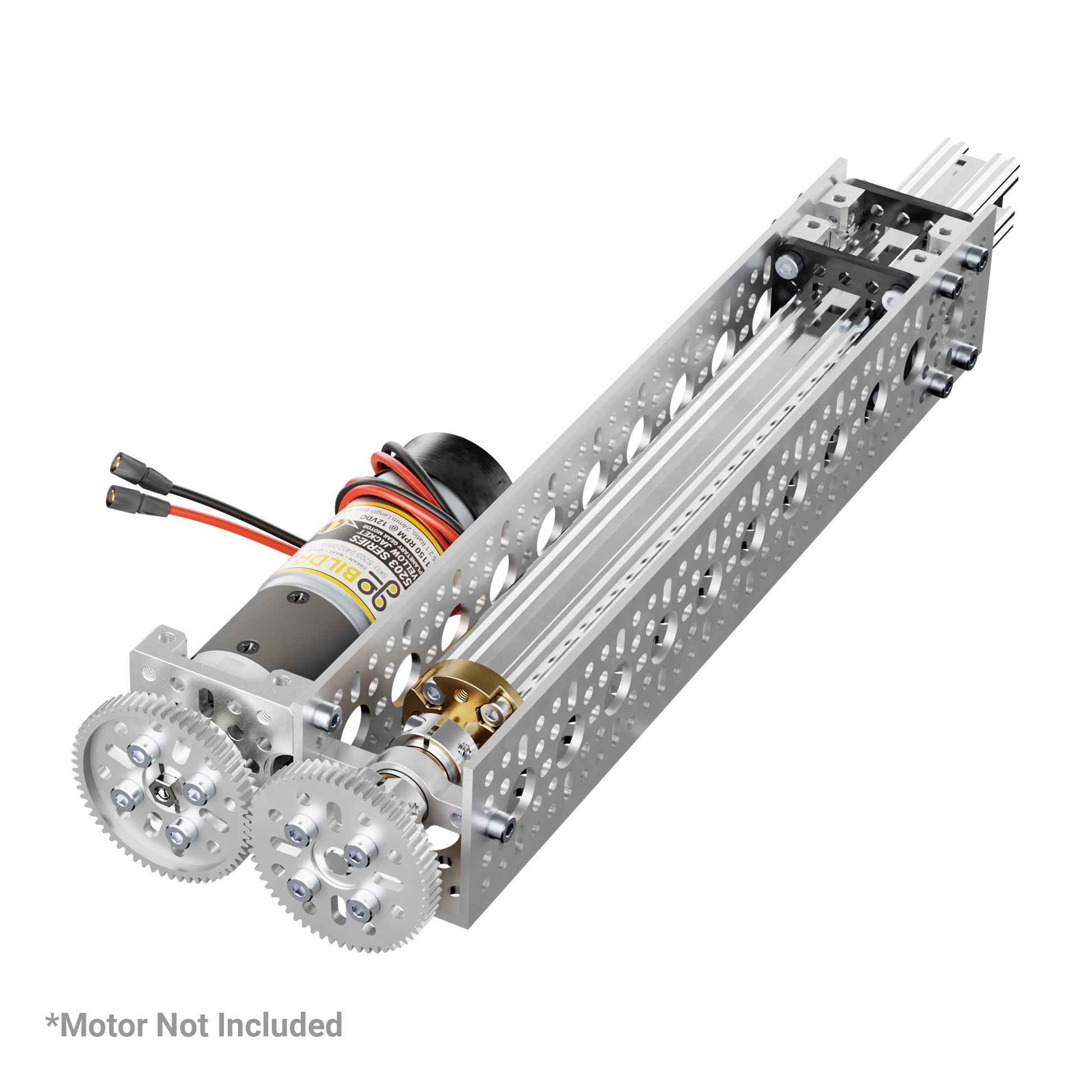 This kit comes with all the pieces to build a linear actuator entirely out of goBILDA® components. The 1120 Series U-Channel serves as the outside framework and the 1109 Series goRAIL as the extension tube. The goRAIL is supported by a pair of acetal plates that can be mounted anywhere along the channel, changing the overall extension length and amount of lateral support they provide. The 60 tooth gear on the motor drives the 60 tooth gear mounted to the lead screw to create a compact 1:1 ratio.