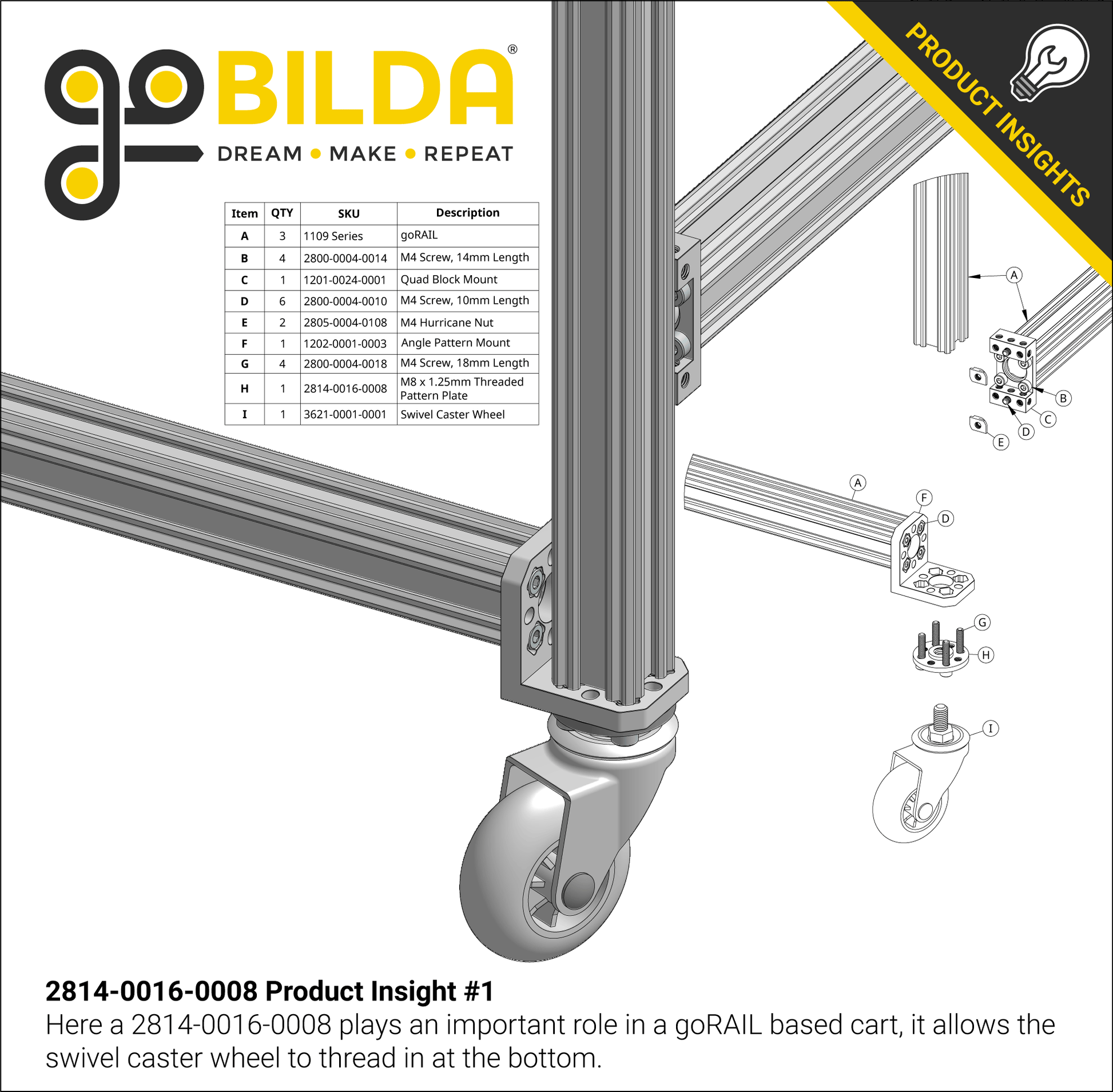 This Stainless Steel Pattern Plate has the goBILDA 16mm square pattern and 24mm diagonal pattern with an M8 x 1.25mm threaded center. It makes it easy to added M8 x 1.25mm screws and items with M8 x 1.25mm studs to your goBILDA project.
