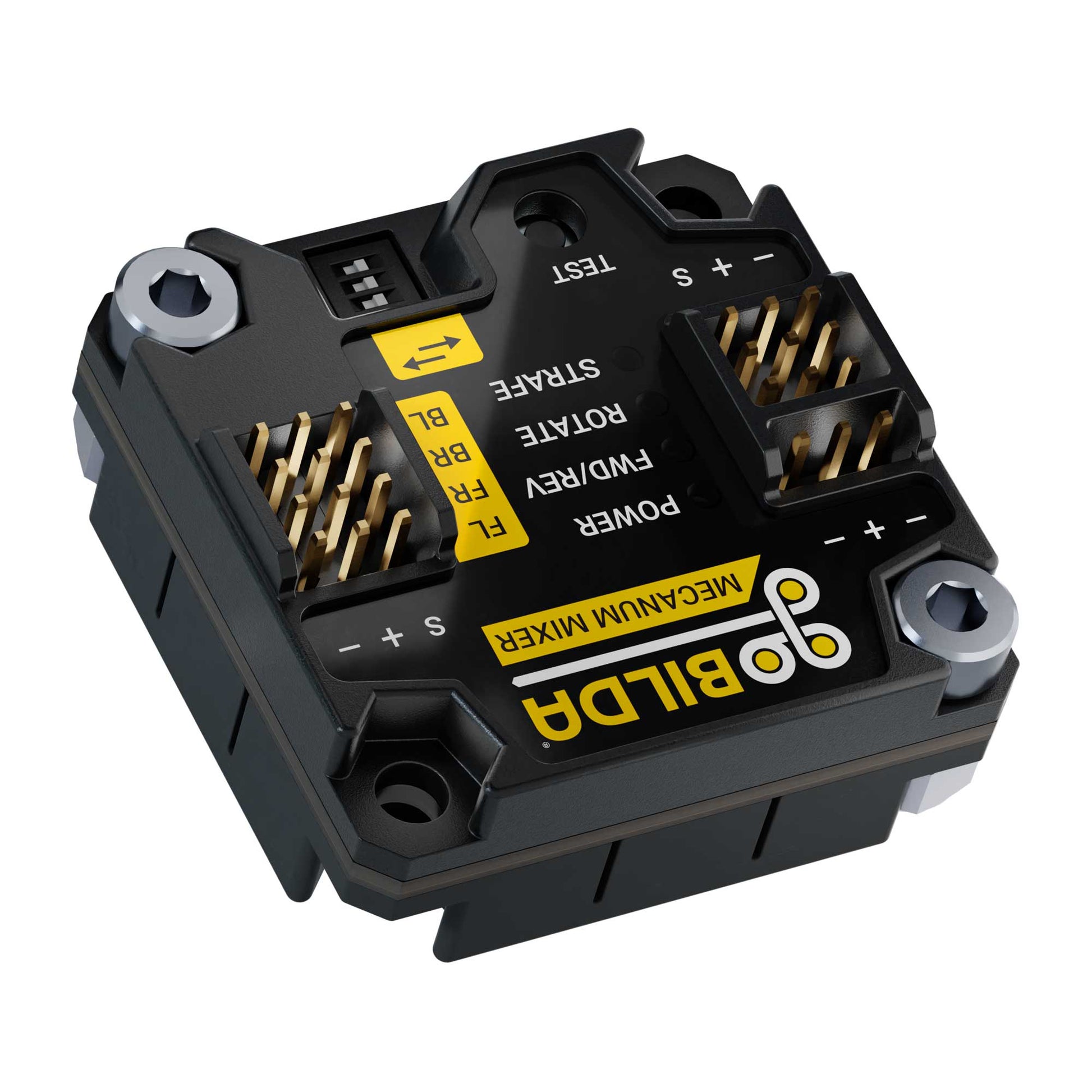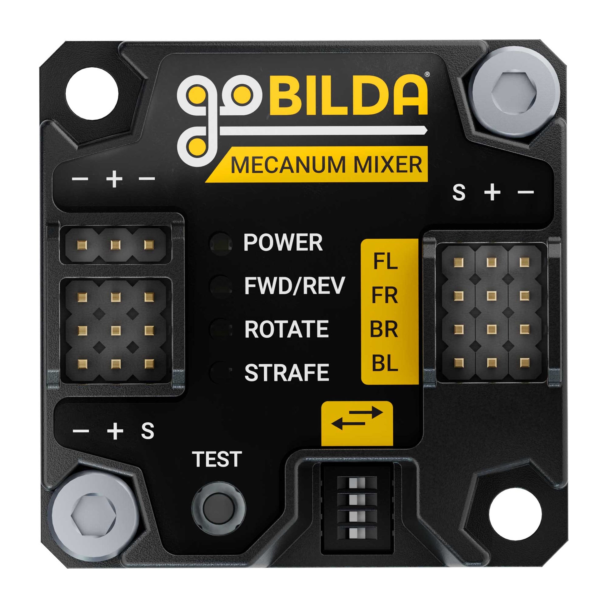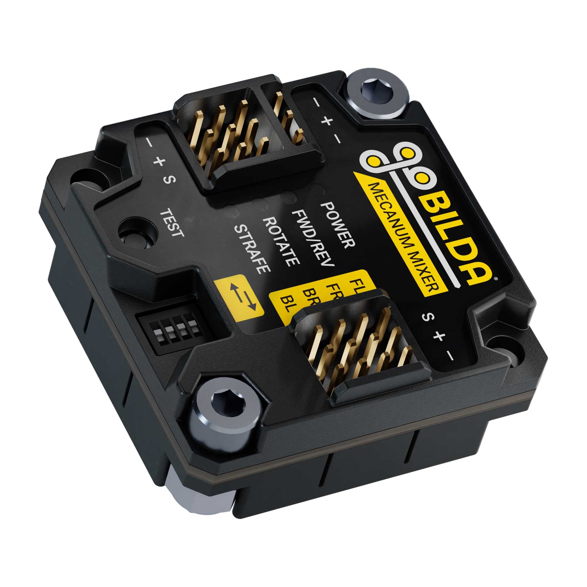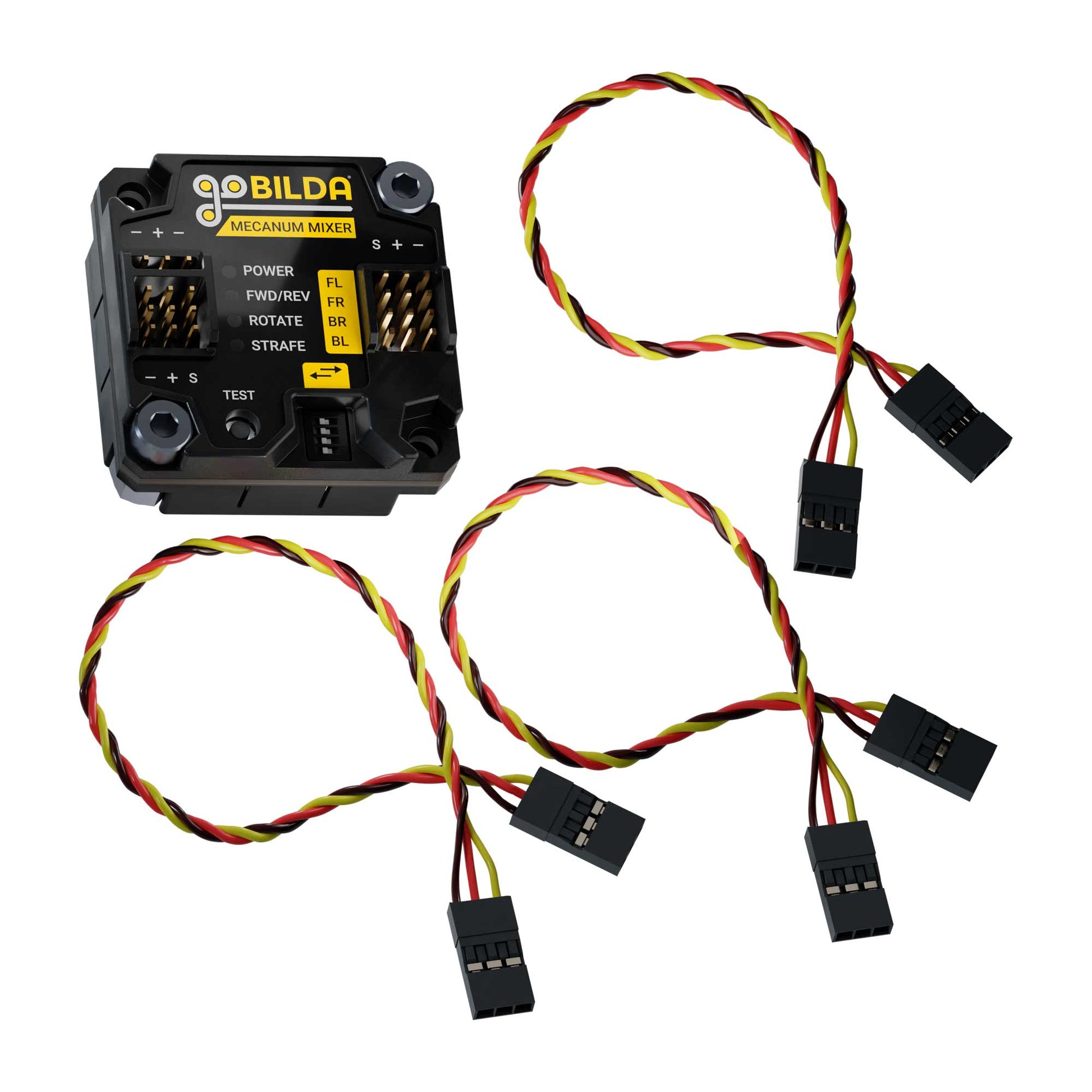 The Mecanum Mixer is a crazy-simple, no-coding solution for the control of a mecanum chassis (like the Strafer®!). Just plug it into your receiver and motor controllers, then let its signal mixing handle the rest. Your chassis will be skid-steering and strafing—both horizontally and diagonally—in no time at all!