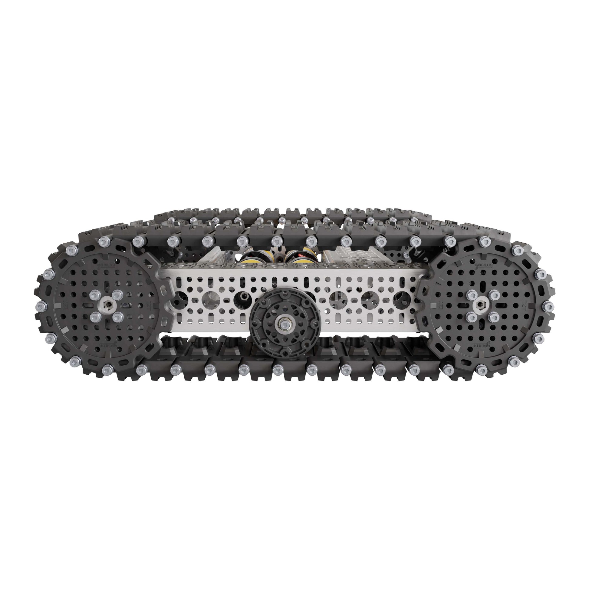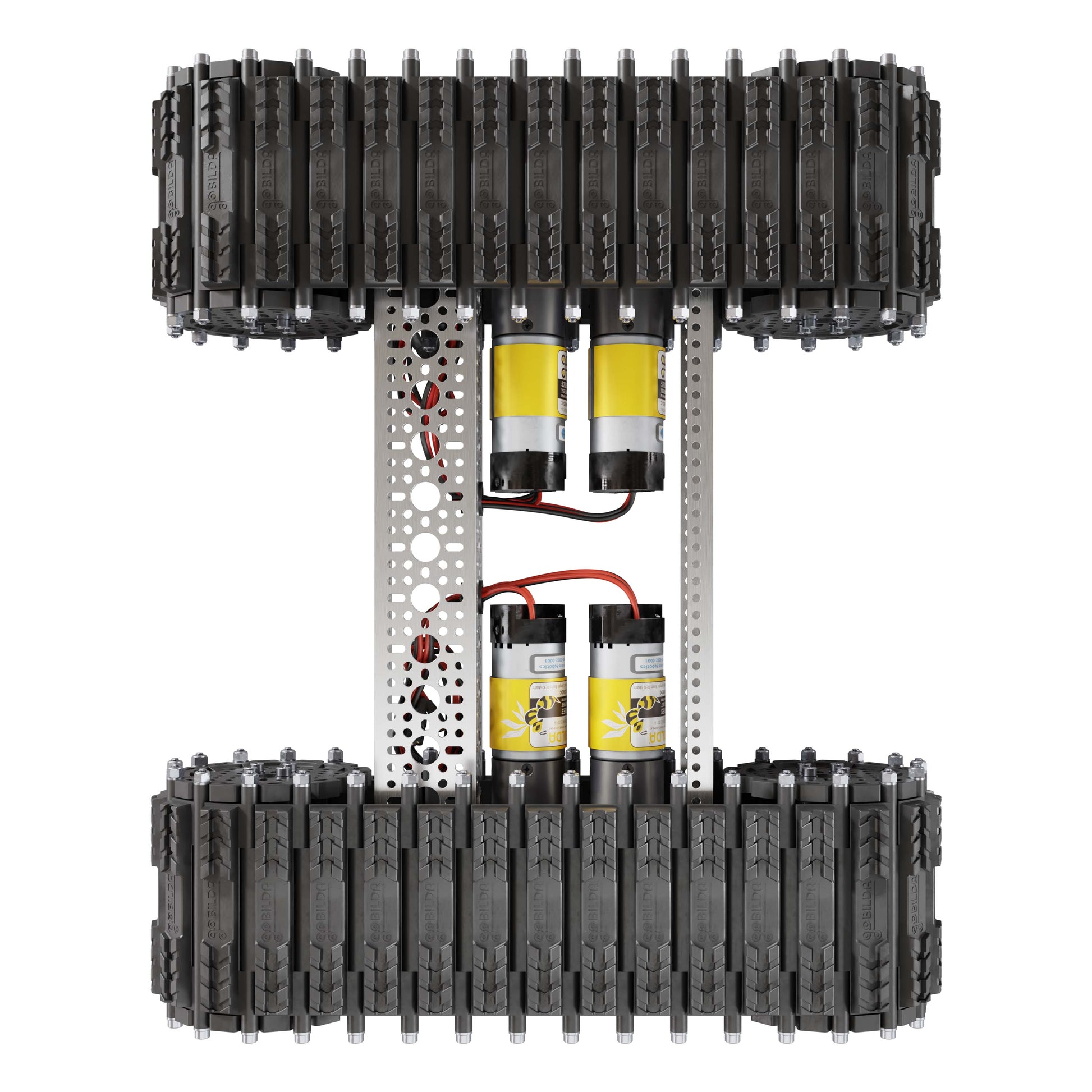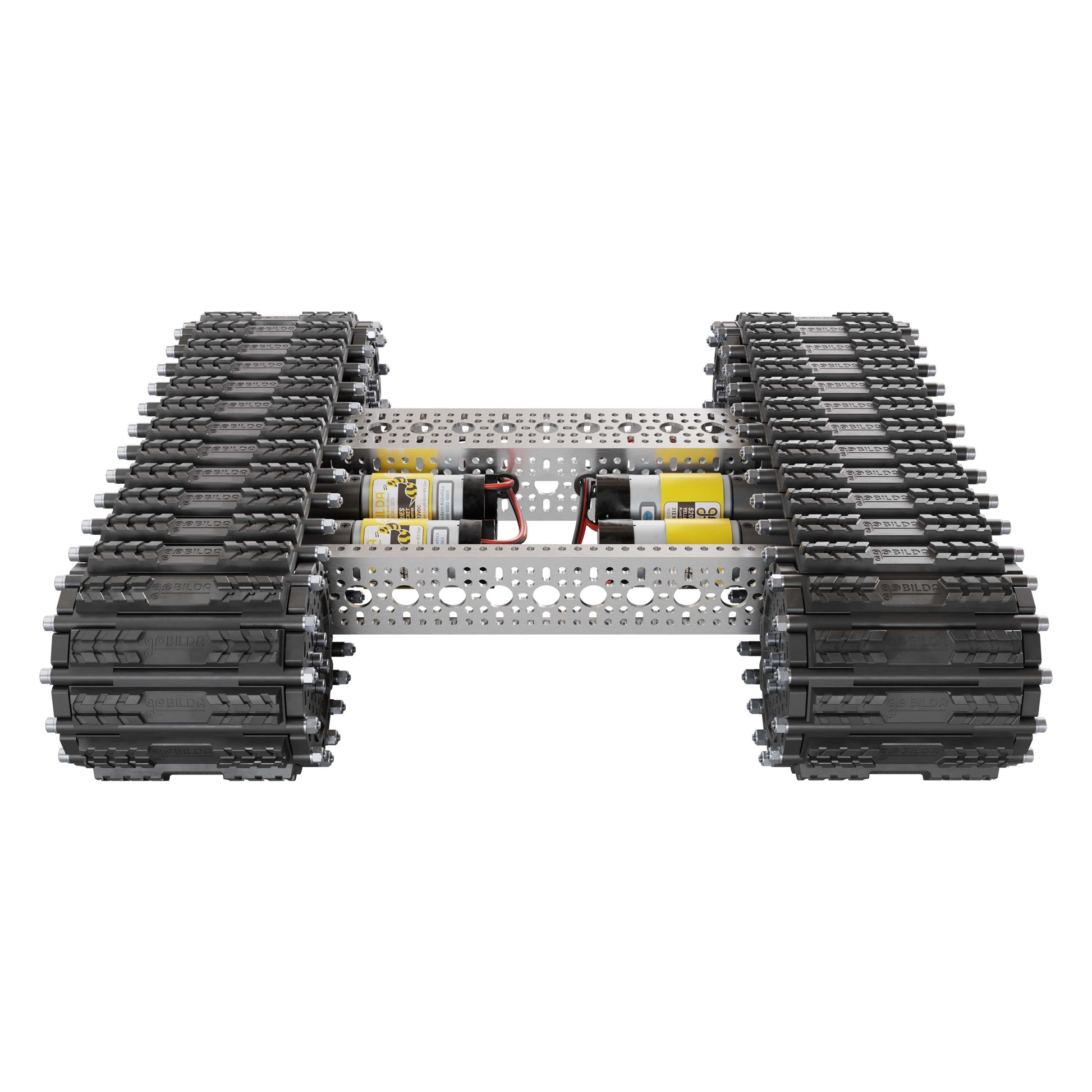 The Outlaw Chassis Kit is the tank track base you've been waiting for! It uses goBILDA Badlands Tank Tracks which are crazy robust and feature bonded rubber for fantastic traction. Whether you are building a tank, scale construction equipment, a sci-fi-inspired robot, or you just want an awesome-looking chassis, the Outlaw is the perfect chassis for you!