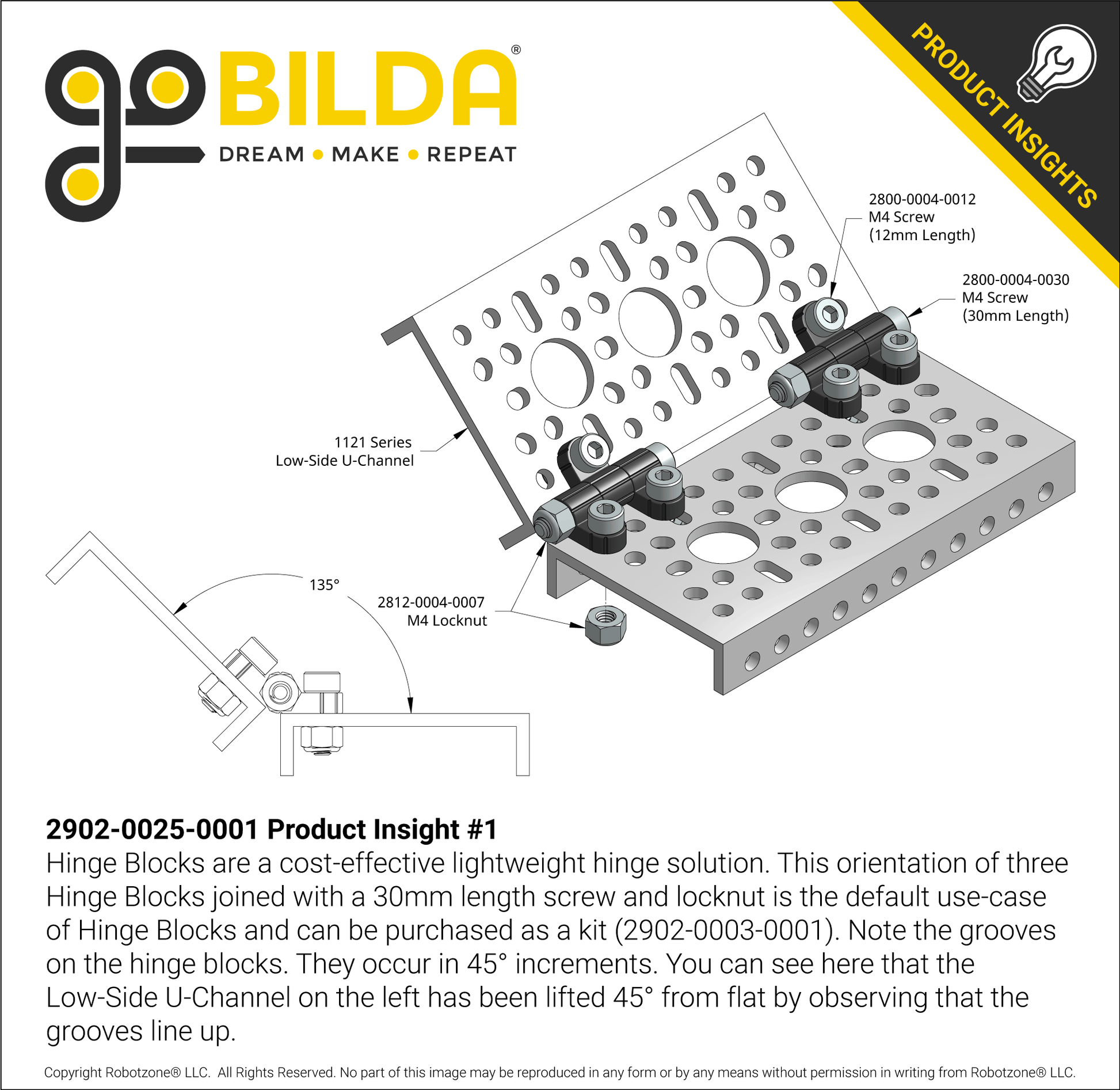 Plastic Hinge Blocks open the door to swivel functionality across a variety of installations. Their on-pattern design allows for a myriad of creative combinations. Fasten multiple blocks together with an M4 screw and a locknut to create the perfect hinge for your project, or explore non-hinge applications by tightening a bolt to secure the blocks at a specific angle–easily measured thanks to grooves at 45° on each block!