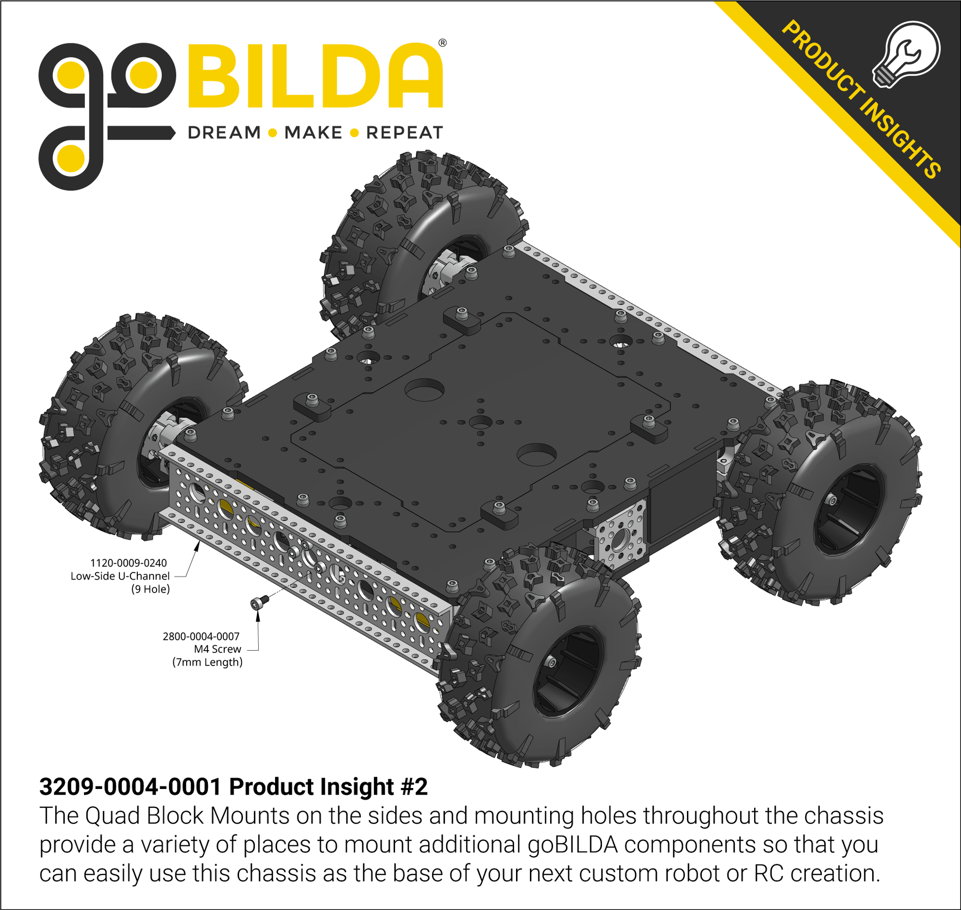 The door panel gives easy access to the inside where there is room for your battery and electronics. The exterior has plenty of mounting options to clad on goBILDA components allowing you to easily transform this base into a full-on custom project.