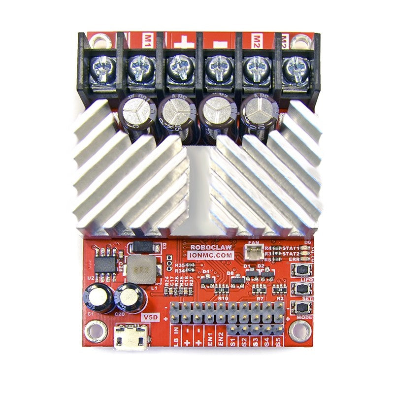 The Roboclaw 2x15A motor controller by Ion Motion Control can supply two brushed DC Motors with 15 Amps continuous and up to 30 Amps peak. With its multi mode interface it can be controlled from USB, RC Radio, serial devices, analog and or microcontrollers such as an Arduino or Raspberry Pi. Dual quadrature encoders with up to 19.6 million pulses per second are supported. In addition, a wide range of sensor inputs including potentiometers and absolute encoders are supported. Roboclaw's close loop functionality creates absolute control over speed, velocity and direction regardless of loading changes. At the heart of Roboclaw is a high performance motion control intelligence which achieves a higher precision of control while providing better motor performance in open or closed loop modes. With Roboclaw's synchronous regenerative capabilities it will charge a supply battery during slow down or breaking action. With it's advanced circuitry it can also change direction during full throttle without damage! Roboclaw also incorporates a lithium cutoff mode protecting batteries from damage.
