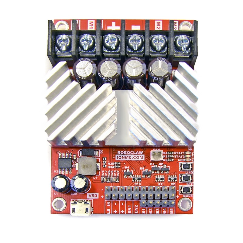 The Roboclaw 2x30A motor controller by Ion Motion Control can supply two brushed DC motors with 30 Amps continuous and up to 60 Amps peak. With its multi mode interface it can be controlled from USB, RC radio, serial devices, analog and or microcontrollers such as an Arduino or Raspberry Pi. Dual quadrature encoders with up to 19.6 million pulses per second are supported. In addition, a wide range of sensor inputs including potentiometers and absolute encoders are supported. Roboclaw's close loop functionality creates absolute control over speed, velocity and direction regardless of loading changes. At the heart of Roboclaw is a high performance motion control intelligence which achieves a higher precision of control while providing better motor performance in open or closed loop modes. With Roboclaw's synchronous regenerative capabilities it will charge a supply battery during slow down or breaking action. With it's advanced circuitry it can also change direction during full throttle without damage! Roboclaw also incorporates a lithium cutoff mode protecting batteries from damage.