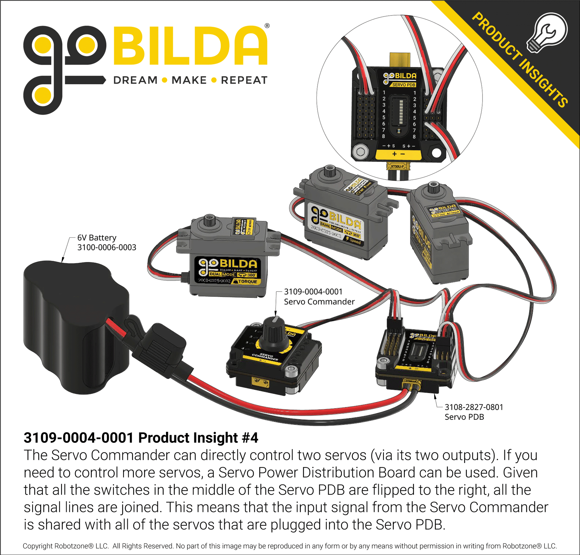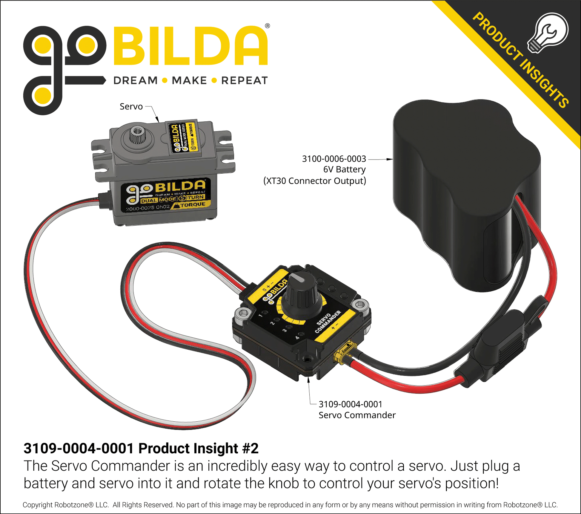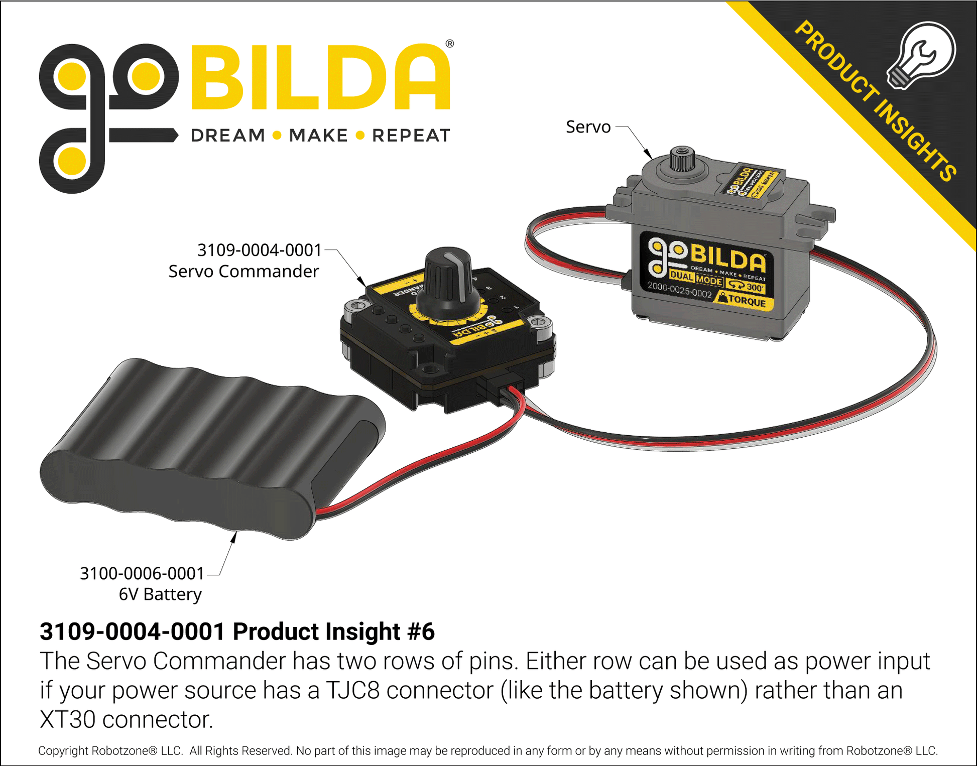 ⚠️VOLTAGE WARNING:The voltage you power the Servo Commander with will be passed on to the servo. DO NOT use a voltage that is higher than your servo is rated for. Sending a voltage higher than that for which your servo is rated will result in damage to the servo.