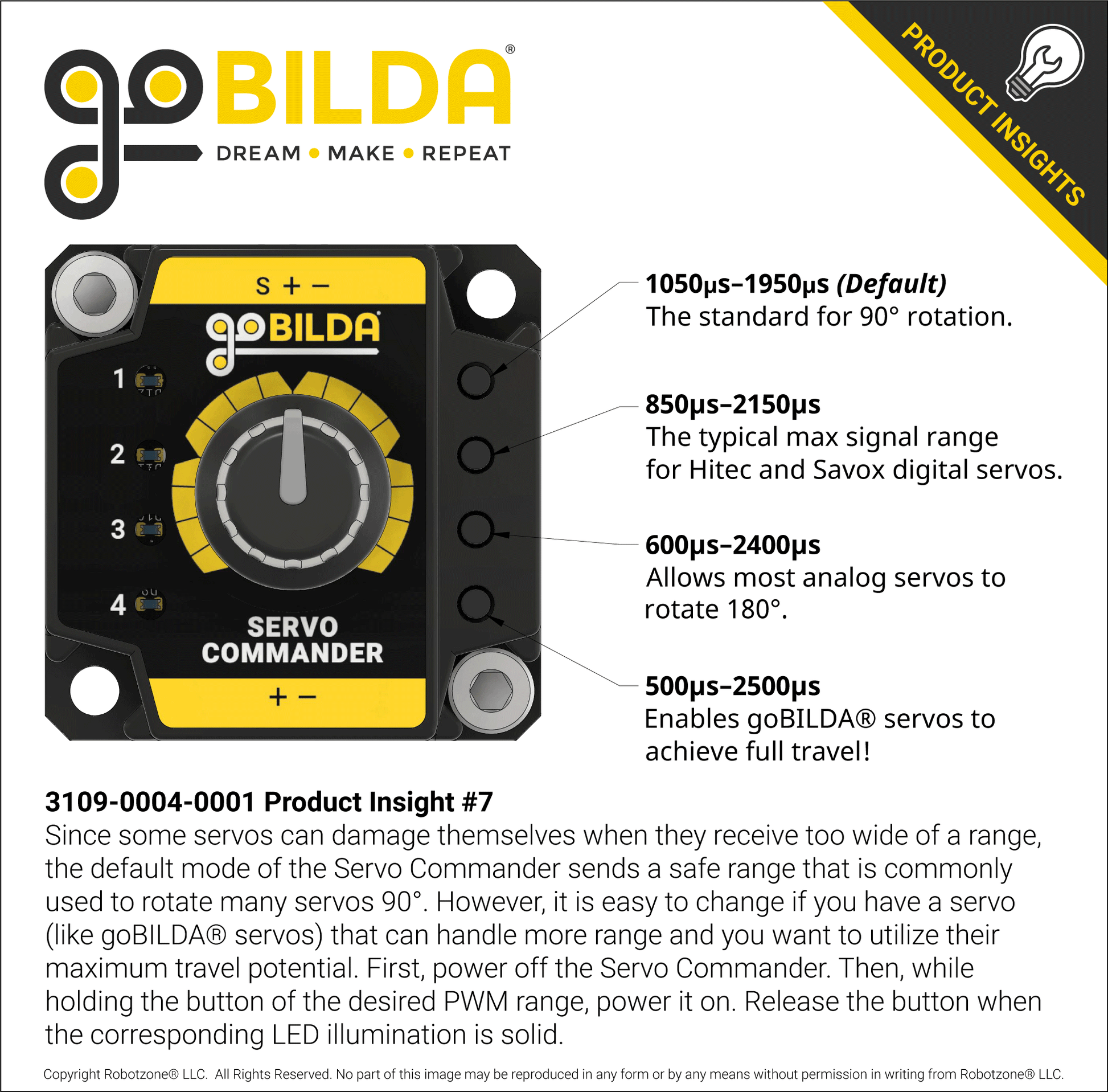 Each of the Servo Commander’s 4 preset PWM ranges has been specially selected by the goBILDA® R&D team to provide you the best options for a variety of servos!