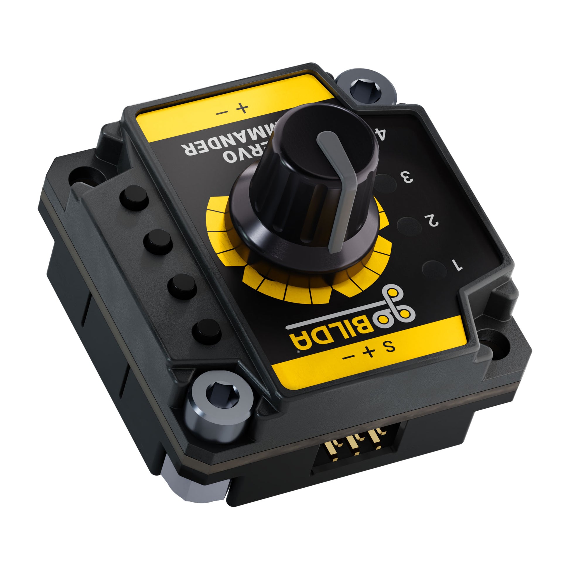 Rule the rotation of your servo with the Servo Commander! Its input knob provides real-time servo control while four buttons store configurable travel positions. You can even use the buttons to select your preferred PWM range among four preset options during power-up!