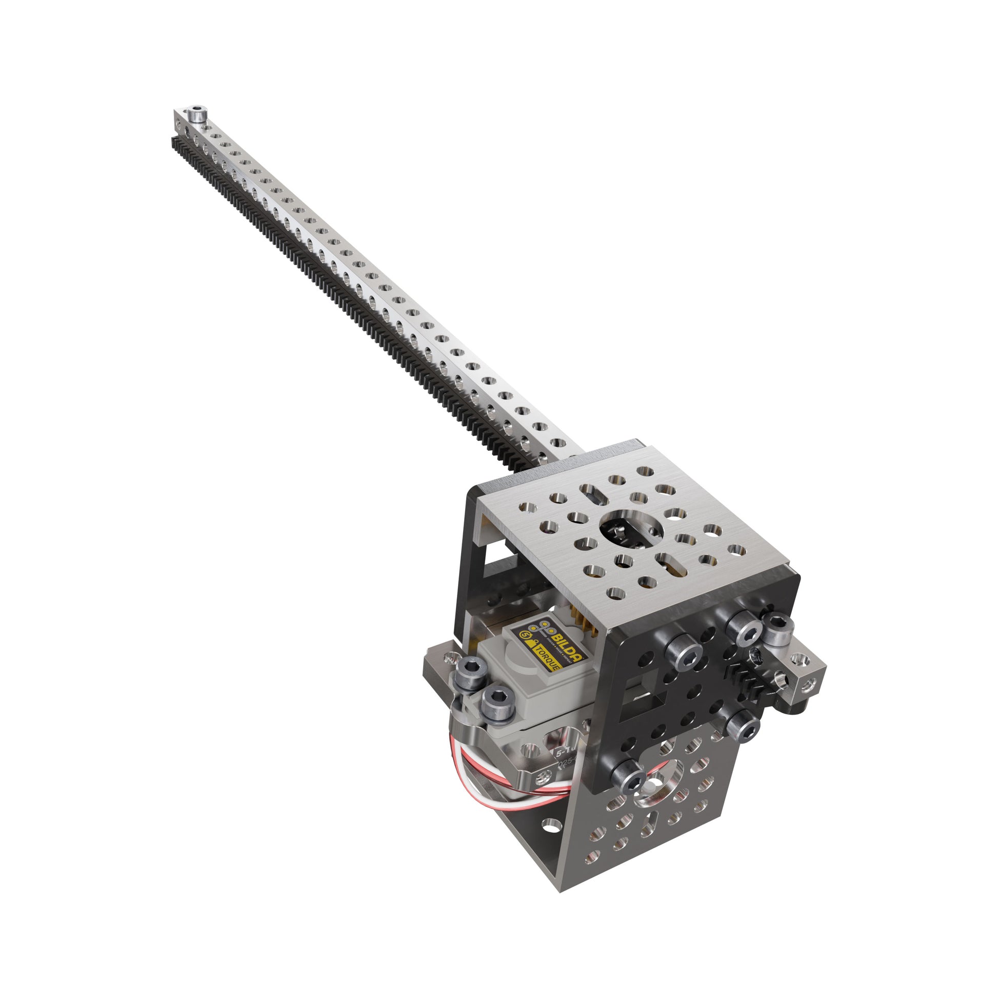 The single gear rack is fastened to a Square Beam that allows for a huge variety of attachment options via threaded holes on the goBILDA® 16mm linear pattern. The included U-Channel structure, meanwhile, provides a multitude of mounting possibilities. Aside from utilizing the build-system-wide attachment possibilities of the goBILDA® 16mm square pattern thru holes and 14mm center holes in the kit’s included U-Channel, you can also swap out either or both of the included channel with a same-Series channel length of your choice.